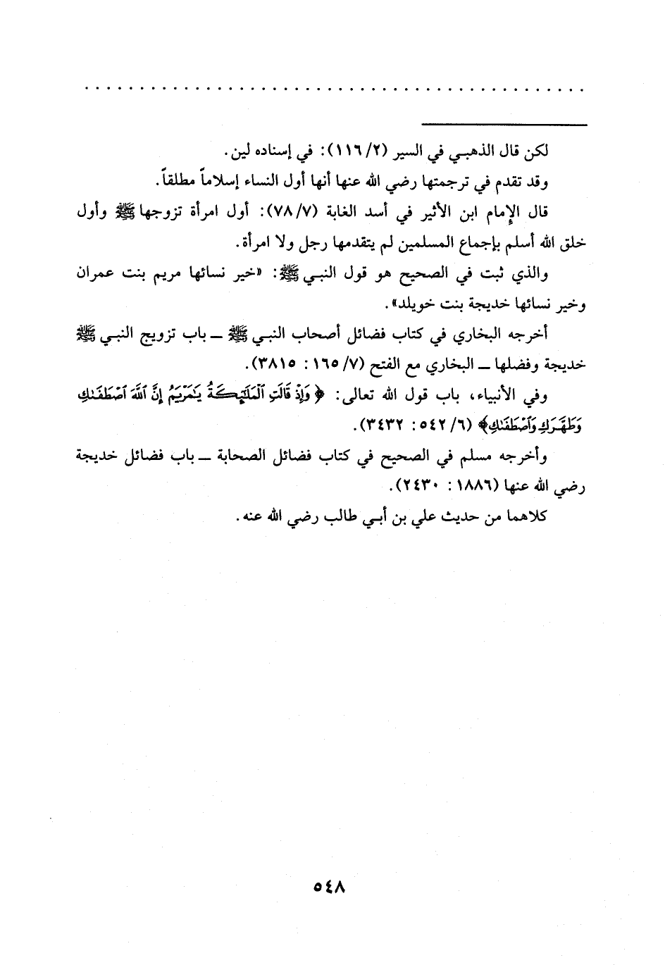 قال الإِمام ابن الأثير في أسد الغابة (7/ 78): أول امرأة تزوجها -صلى الله عليه وسلم- وأول خلق الله أسلم بإجماع المسلمين لم يتقدمها رجل ولا امرأة.