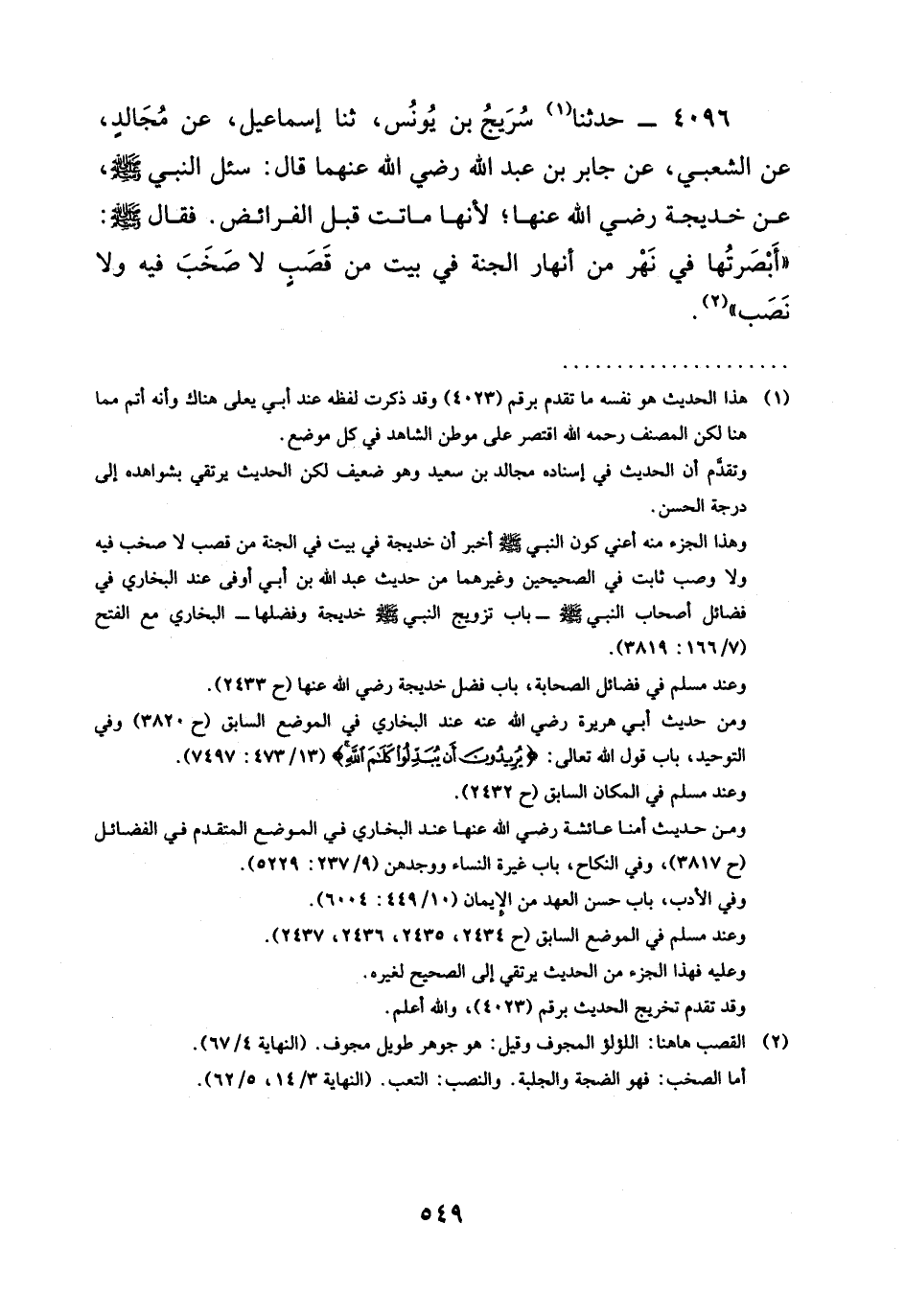 4096 - حَدَّثَنَا سُرَيْجُ بْنُ يُونُسَ، ثنا إِسْمَاعِيلُ، عَنْ مُجَالِدٍ، عَنِ الشَّعْبِيِّ، عَنْ جَابِرِ بْنِ عبد الله رَضِيَ الله عَنْهما قَالَ: سُئِلَ النَّبِيُّ صَلَّى اللَّهُ عَلَيْهِ وَسَلَّمَ، عن خديجة رَضِيَ الله عَنْها؛ لِأَنَّهَا مَاتَتْ قَبْلَ الْفَرَائِضِ. فَقَالَ صَلَّى اللَّهُ عَلَيْهِ وَسَلَّمَ: " §أَبْصَرْتُهَا فِي نَهَرٍ مِنْ أَنْهَارٍ الْجَنَّةِ فِي بَيْتٍ مِنْ قَصَبٍ لَا صَخَبَ فِيهِ وَلَا نَصَبَ ".