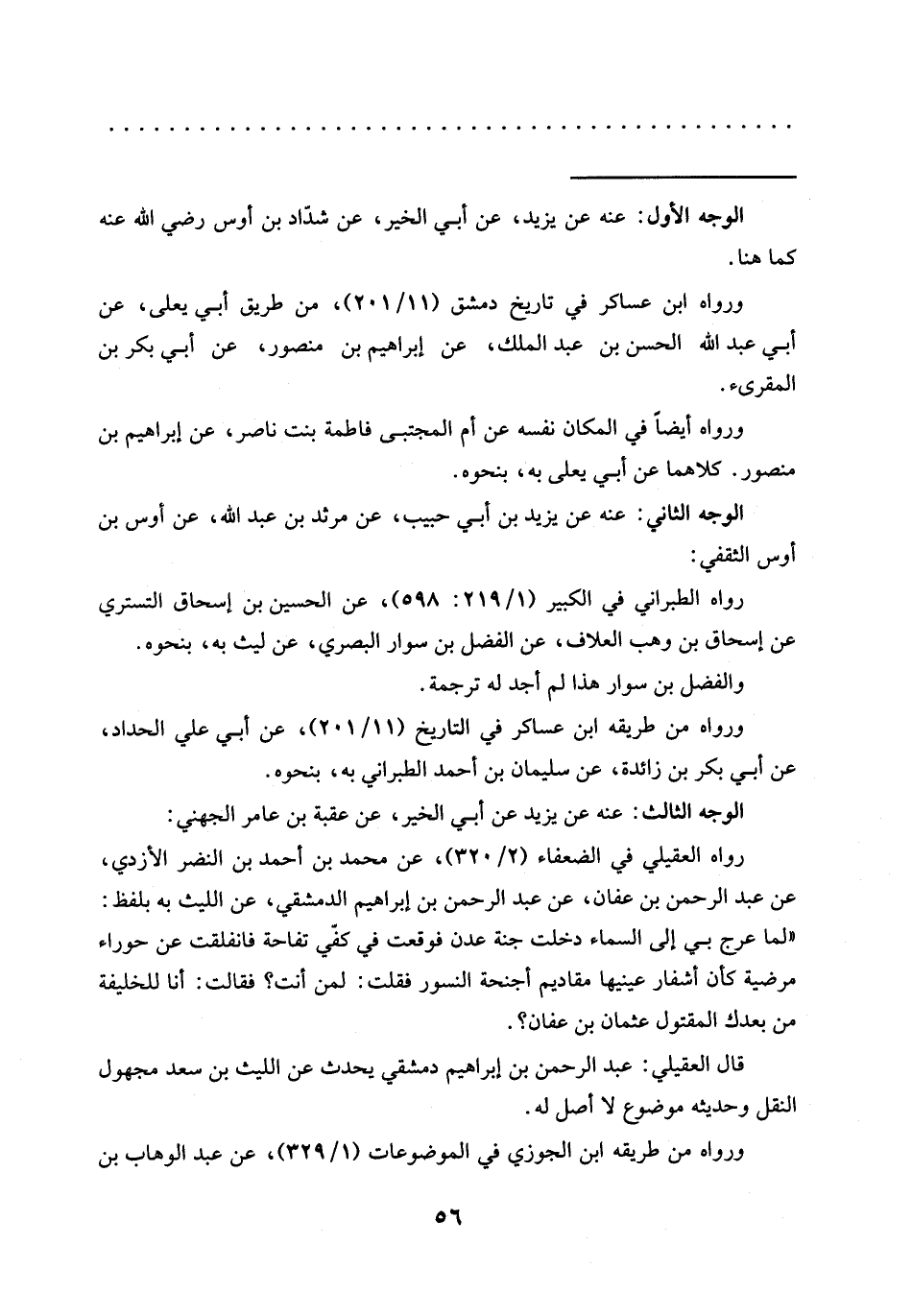 الوجه الثالث: عنه عن يزيد عن أبي الخير، عن عقبة بن عامر الجهني: رواه العقيلي في الضعفاء (2/ 320)، عن محمد بن أحمد بن النضر الأزدي، عن عبد الرحمن بن عفان، عن عبد الرحمن بن إبراهيم الدمشقي، عن الليث به بلفظ: