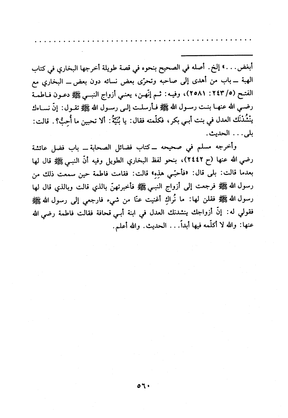 وأخرجه مسلم في صحيحه -كتاب فضائل الصحابة- باب فضل عائشة رضي الله عنها (ح 2442)، بنحو لفظ البخاري الطويل وفيه أن النبي -صلى الله عليه وسلم- قال لها بعدما قالت: بلى قال: "فأحبّي هذِهِ" قالت: فقامت فاطمة حين سمعت ذلك من رسول الله -صلى الله عليه وسلم- فرجعت إِلَى أَزْوَاجِ النَّبِيِّ -صَلَّى اللَّهُ عَلَيْهِ وَسَلَّمَ- فأخبرتهنّ بالذي قالت وبالذي قال لَهَا رَسُولُ اللَّهِ -صَلَّى اللَّهُ عَلَيْهِ وَسَلَّمَ- فقلن لها: ما نُراكِ أغنيت عنّا من شيء فارجعي إلى رسول الله -صلى الله عليه وسلم- فقولي له: إنّ أزواجك ينشدنك العدل في ابنة أبي قحافة فقالت فاطمة رضي الله عنها: والله لا أكلّمه فيها أبدًا ... الحديث. والله أعلم.