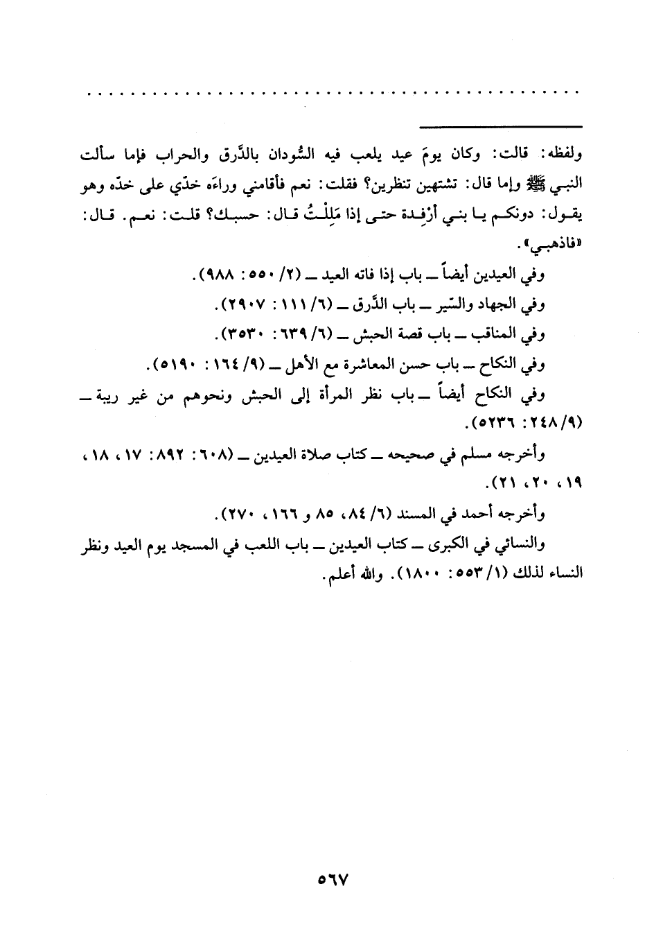 = ولفظه: قالت: وكان يومَ عيد يلعب فيه السُّودان بالدَّرق والحراب فإما سألت النبي -صلى الله عليه وسلم- وإما قال: تشتهين تنظرين؟ فقلت: نعم فأقامني وراءَه خدّي على خدّه وهو يقول: دونكم يا بني أرْفِدة حتى إذا مَلِلْتُ قال: حسبك؟ قلت: نعم. قال: "فاذهبي".