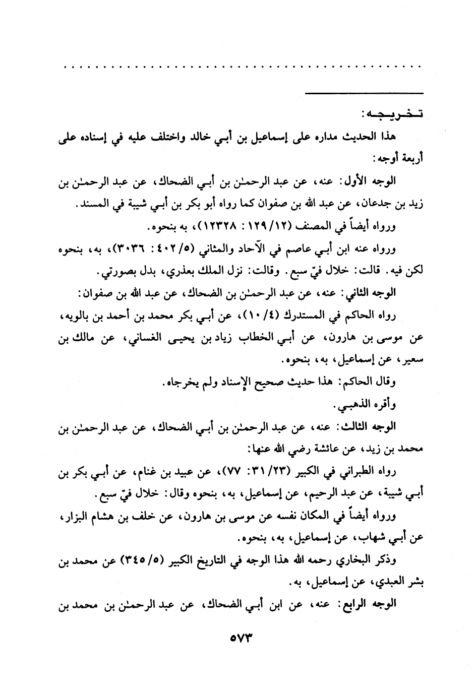 الوجه الثاني: عنه، عن عبد الرحمن بن الضحاك، عن عبد الله بن صفوان: رواه الحاكم في المستدرك (4/ 10)، عن أبي بكر محمَّد بن أحمد بن بالويه، عن موسى بن هارون، عن أبي الخطاب زياد بن يحيى الغساني، عن مالك بن سعير، عن إسماعيل، به، بنحوه.