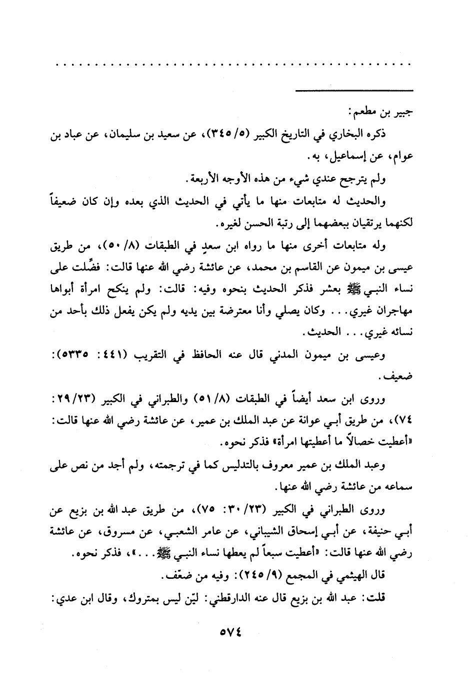 وروى الطبراني في الكبير (23/ 30: 75)، من طريق عبد الله بن بزيع عن أبي حنيفة، عن أبي إسحاق الشيباني، عن عامر الشعبي، عن مسروق، عن عائشة رضي الله عنها قالت: "أعطيت سبعًا لم يعطها نساء النبي -صلى الله عليه وسلم- ... "، فذ نحوه.
