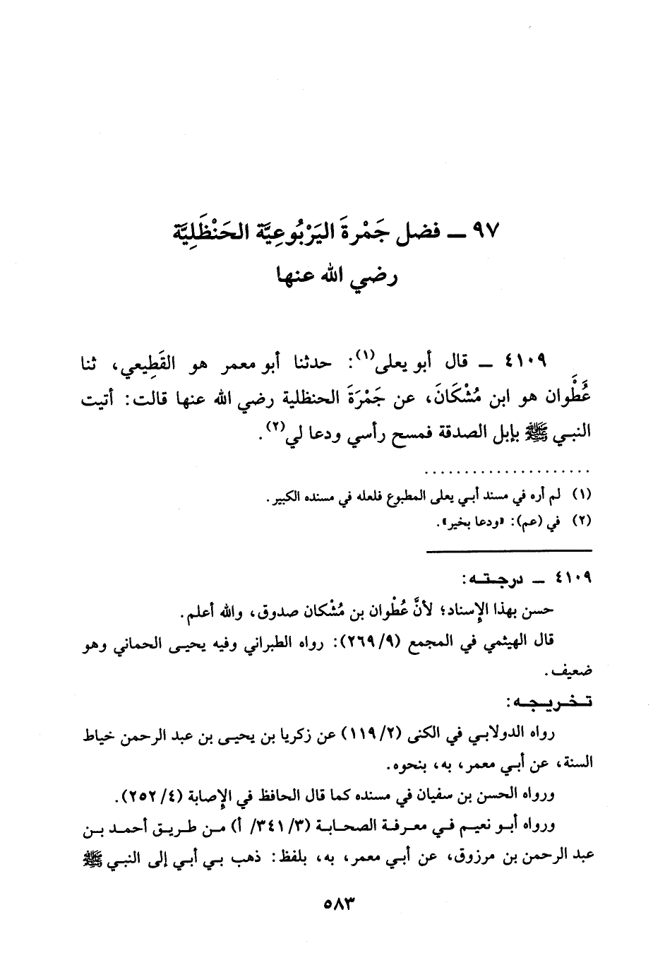 4109 - قَالَ أَبُو يَعْلَى: حدثنا أَبُو مَعْمَرٍ هُوَ الْقَطِيعِيُّ، ثنا عَطْوَانُ هُوَ ابْنُ مشكان، عَنْ جمرة الحنظلية رَضِيَ الله عَنْها قَالَتْ: §أَتَيْتُ النَّبِيَّ صَلَّى اللَّهُ عَلَيْهِ وَسَلَّمَ بِإِبِلِ الصَّدَقَةِ فَمَسَحَ رَأْسِي وَدَعَا لِي.