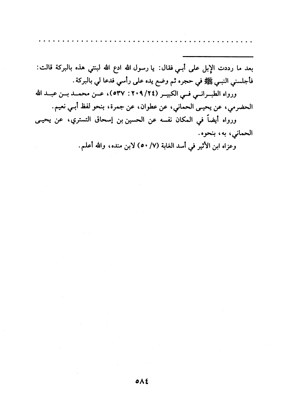 = بعد ما رددت الإبل على أبي فقال: يا رسول الله ادع الله لبنتي هذه بالبركة قالت: فأجلسني النبي -صلى الله عليه وسلم- في حجره ثم وضع يده على رأسي فدعا لي بالبركة.