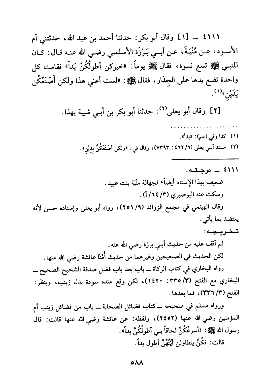 4111 -[1] وَقَالَ أَبُو بَكْرٍ: حَدَّثَنَا أَحْمَدُ بْنُ عَبْدِ اللَّهِ، حَدَّثَتْنِي أُمُّ الْأَسْوَدِ، عَنْ مُنْيَةَ، عَنْ أَبِي بَرْزَةَ الْأَسْلَمِيِّ رَضِيَ الله عَنْه قَالَ: كَانَ لِلنَّبِيِّ صَلَّى اللَّهُ عَلَيْهِ وَسَلَّمَ تِسْعُ نِسْوَةٍ، فَقَالَ صَلَّى اللَّهُ عَلَيْهِ وَسَلَّمَ يَوْمًا: " §خَيْرُكُنَّ أَطْوَلُكُنَّ يَدًا " فَقَامَتْ كُلُّ وَاحِدَةٍ تَضَعُ يَدَهَا عَلَى الجدار، فَقَالَ صَلَّى اللَّهُ عَلَيْهِ وَسَلَّمَ: " لَسْتُ أَعْنِي هَذَا وَلَكِنْ أَصْنَعَكُنَّ يَدَيْنِ ".