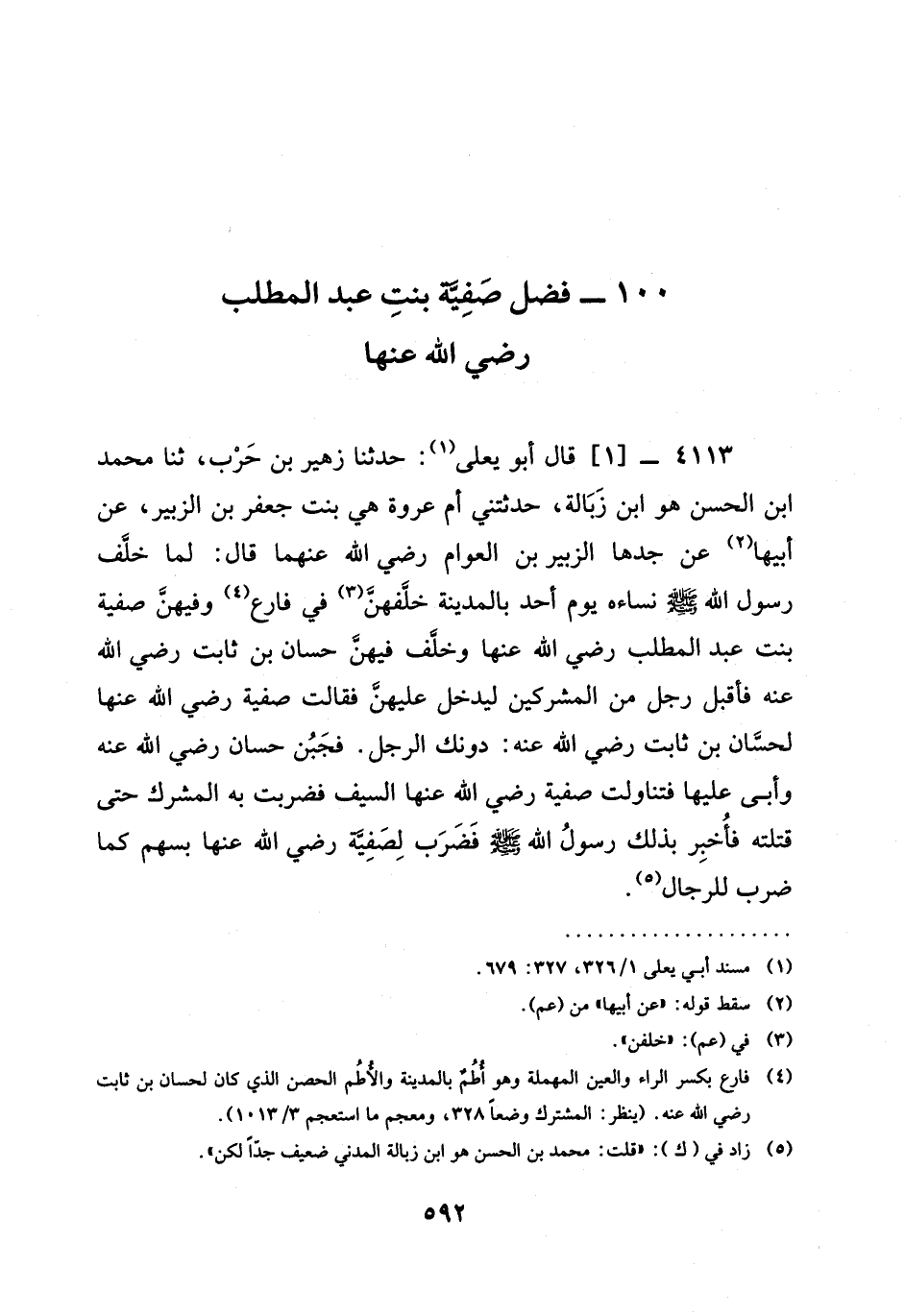 4113 -[1] قَالَ أَبُو يَعْلَى: حدثنا زُهَيْرُ بْنُ حَرْبٍ، ثنا مُحَمَّدُ ابن الْحَسَنِ هُوَ ابْنُ زُبَالَةَ، حَدَّثَتْنِي أُمُّ عُرْوَةَ هِيَ بِنْتُ جَعْفَرِ بْنِ الزُّبَيْرِ، عَنْ أَبِيهَا عَنْ جَدِّهَا الزُّبَيْرِ بن العوام رَضِيَ الله عَنْها قَالَ: §لَمَّا خَلَّفَ رَسُولُ اللَّهِ صَلَّى اللَّهُ عَلَيْهِ وَسَلَّمَ نِسَاءَهُ يَوْمَ أُحُدٍ بِالْمَدِينَةِ خَلَّفَهُنَّ فِي فَارِعٍ وَفِيهِنَّ صَفِيَّةُ بِنْتُ عبد المطلب رَضِيَ الله عَنْها وَخَلَّفَ فِيهِنَّ حَسَّانَ بْنَ ثَابِتٍ رَضِيَ الله عَنْه فَأَقْبَلَ رَجُلٌ مِنَ الْمُشْرِكِينَ لِيَدْخُلَ عَلَيْهِنَّ فقالت صفية رَضِيَ الله عَنْها لِحَسَّانَ بْنِ ثَابِتٍ رَضِيَ الله عَنْه: دُونَكَ الرَّجُلَ. فَجَبُنَ حَسَّانُ رَضِيَ الله عَنْه وَأَبِي عَلَيْهَا فتناولت صفية رَضِيَ الله عَنْها السَّيْفَ فَضَرَبَتْ بِهِ الْمُشْرِكَ حَتَّى قَتَلَتْهُ فَأُخْبِرَ بِذَلِكَ رَسُولُ اللَّهِ صَلَّى اللَّهُ عَلَيْهِ وَسَلَّمَ فضرب لصفية رَضِيَ الله عَنْها بِسَهْمٍ كَمَا ضرب لِلرِّجَالِ.