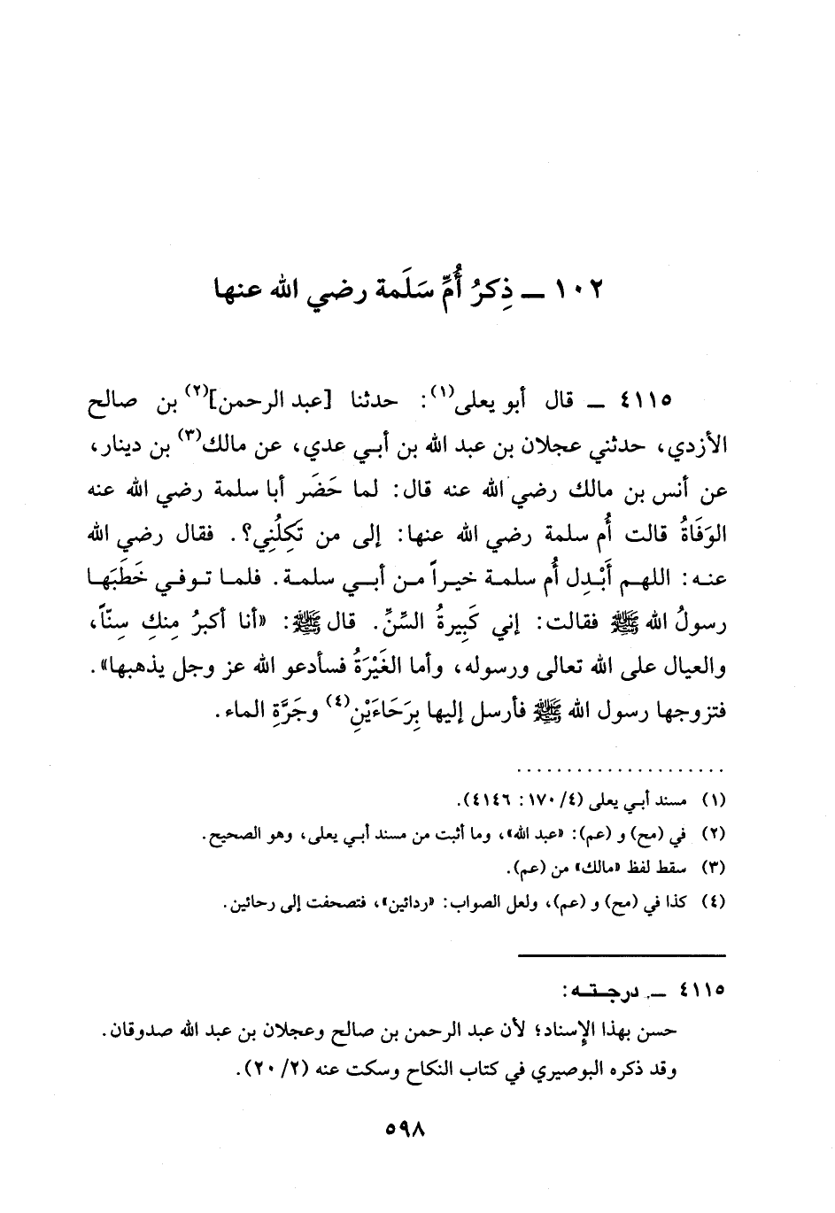 4115 - قَالَ أَبُو يَعْلَى: حدثنا [عبد الرحمن] بْنُ صَالِحٍ الْأَزْدِيُّ، حَدَّثَنِي عَجْلَانُ بْنُ عَبْدِ اللَّهِ بن أبي عَدِيٍّ، عَنْ مَالِكِ بْنِ دِينَارٍ، عَنْ أَنَسِ بْنِ مَالِكٍ رَضِيَ الله عَنْه قَالَ: لَمَّا حَضَرَ أَبَا سَلَمَةَ رَضِيَ الله عَنْه الْوَفَاةُ قَالَتْ أم سلمة رَضِيَ الله عَنْها: إِلَى مَنْ تَكِلُنِي؟ . فَقَالَ رَضِيَ الله عَنْه: اللَّهُمَّ أَبْدِلْ أُمَّ سَلَمَةَ خَيْرًا مِنْ أَبِي سَلَمَةَ. فَلَمَّا تُوُفِّيَ خَطَبَهَا رَسُولُ اللَّهِ صَلَّى اللَّهُ عَلَيْهِ وَسَلَّمَ فَقَالَتْ: إِنِّي كَبِيرَةُ السِّنِّ. قَالَ صَلَّى اللَّهُ عَلَيْهِ وَسَلَّمَ: " §أَنَا أَكْبَرُ مِنْكِ سِنًّا، وَالْعِيَالُ على الله تعالى وَرَسُولِهِ، وَأَمَّا الْغَيْرَةُ فسأدعو الله عز وجل يُذْهِبُهَا ". فَتَزَوَّجَهَا رَسُولُ اللَّهِ صَلَّى اللَّهُ عَلَيْهِ وَسَلَّمَ فَأَرْسَلَ إِلَيْهَا برحاءين وَجَرَّةِ الْمَاءِ.