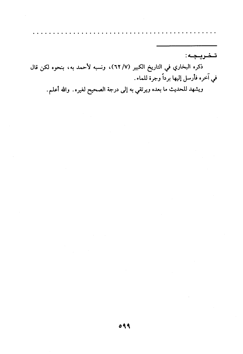ذكره البخاري في التاريخ الكبير (7/ 62)، ونسبه لأحمد به، بنحوه لكن قال في آخره فأرسل إليها بردًا وجرة للماء.