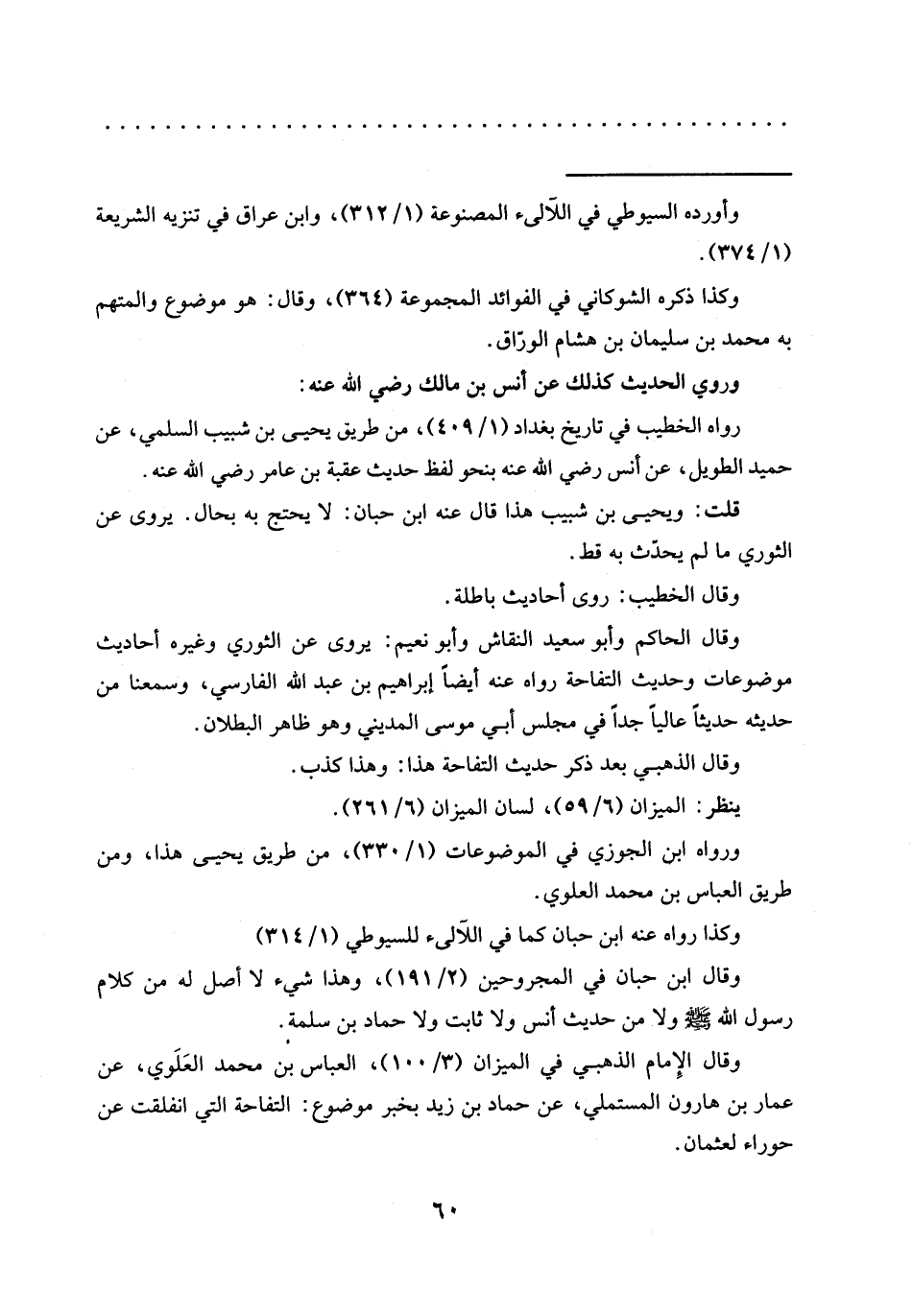 وكذا رواه عنه ابن حبّان كما في اللآلىء للسيوطي (1/ 314) وقال ابن حبّان في المجروحين (2/ 191)، وهذا شيء لا أصل له من كلام رسول الله -صلى الله عليه وسلم- ولا من حديث أنس ولا ثابت ولا حماد بن سلمة.