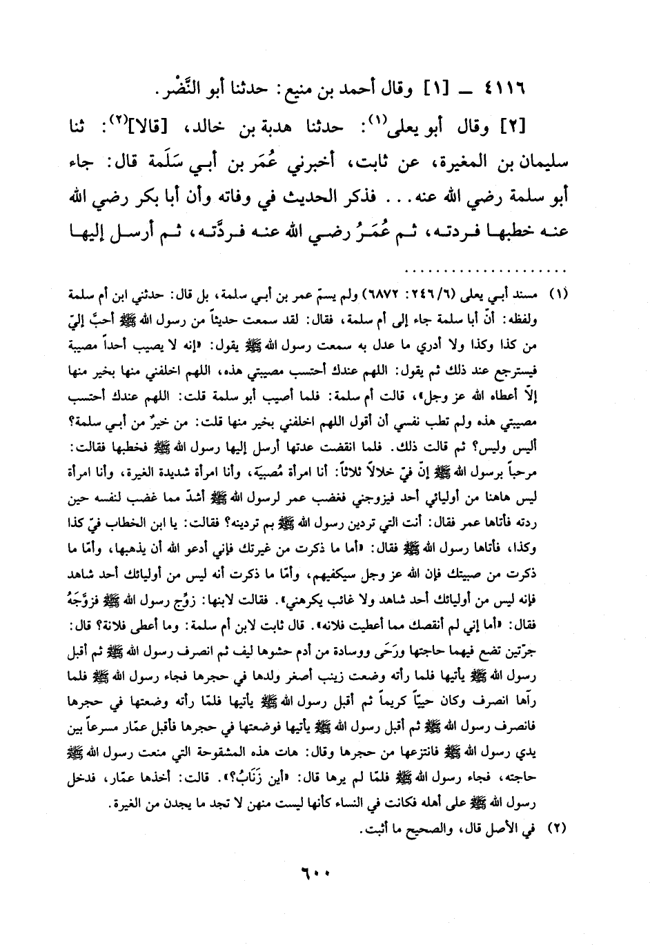 [2] وَقَالَ أَبُو يَعْلَى: حدثنا هُدْبَةُ بْنُ خَالِدٍ، [قَالَا] : ثنا سُلَيْمَانُ بْنُ الْمُغِيرَةِ، عَنْ ثَابِتٍ، أَخْبَرَنِي عُمَرُ بْنُ أَبِي سَلَمَةَ قَالَ: جَاءَ أَبُو سَلَمَةَ رَضِيَ الله عَنْه ... فَذَكَرَ الحديث في وفاته وَأَنَّ أَبَا بَكْرٍ رَضِيَ الله عَنْه خَطَبَهَا فَرَدَّتْهُ، ثُمَّ عُمَرُ رَضِيَ الله عَنْه فَرَدَّتْهُ، ثُمَّ §أَرْسَلَ إِلَيْهَا
