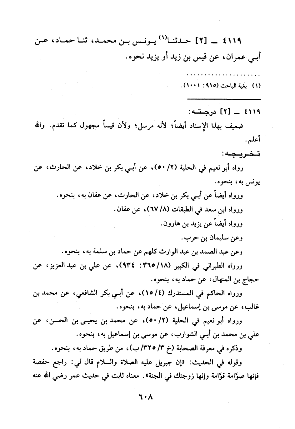 4119 - [2] حَدَّثَنَا (¬1) يُونُسُ بْنُ محمَّد، ثنا حَمَّادٌ، عَنْ أَبِي عِمْرَانَ، عَنْ قَيْسِ بْنِ زَيْدٍ أَوْ يَزِيدَ نحوه.