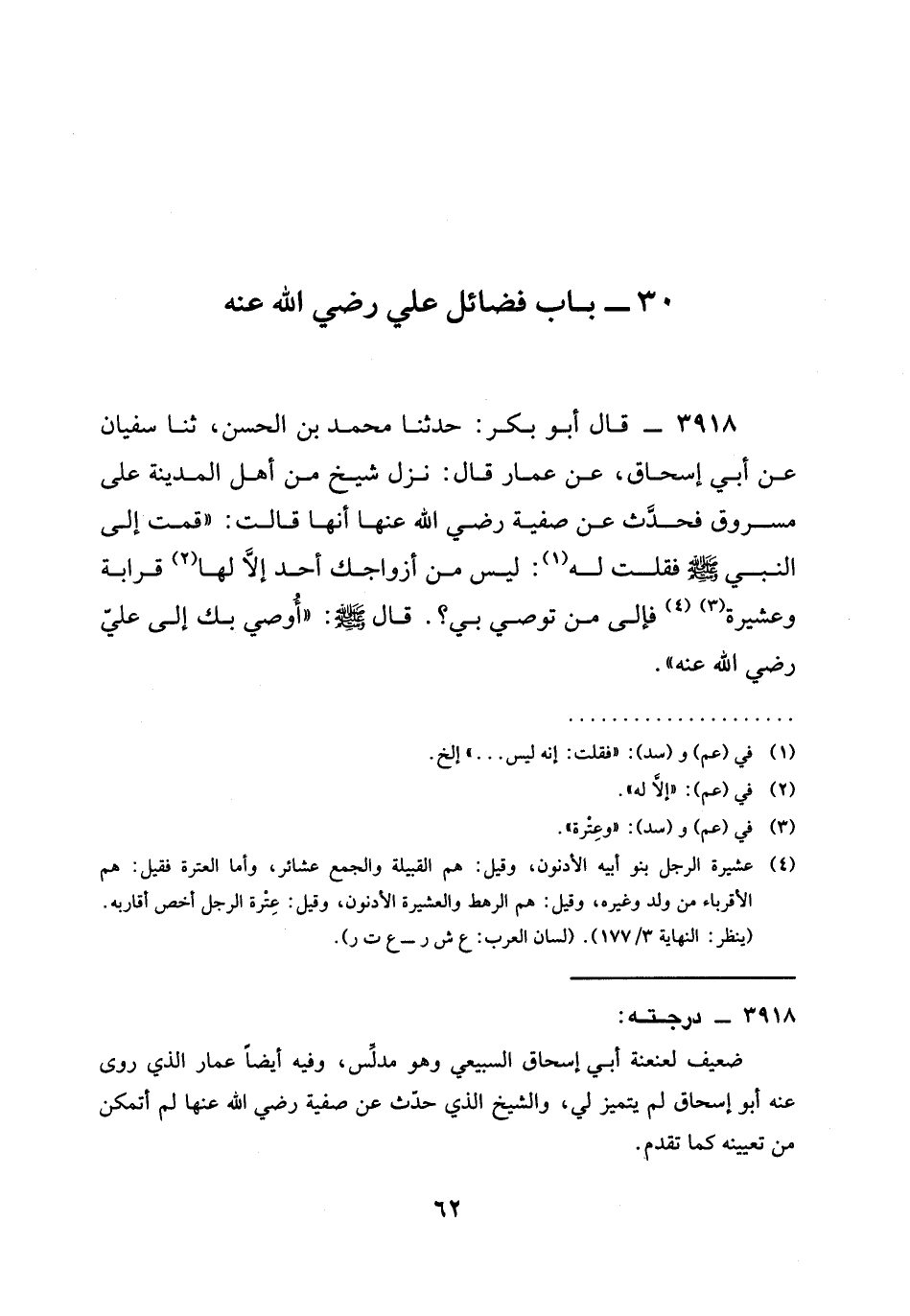 3918 - قَالَ أَبُو بَكْرٍ: حدثنا مُحَمَّدُ بْنُ الْحَسَنِ، ثنا سُفْيَانُ عَنْ أَبِي إِسْحَاقَ، عَنْ عَمَّارٍ قَالَ: نَزَلَ شَيْخٌ مِنْ أَهْلِ الْمَدِينَةِ عَلَى مَسْرُوقٍ فَحَدَّثَ عن صفية رَضِيَ الله عَنْها أَنَّهَا قَالَتْ: " قُمْتُ إِلَى النَّبِيِّ صَلَّى اللَّهُ عَلَيْهِ وَسَلَّمَ فَقُلْتُ لَهُ: §لَيْسَ مِنْ أَزْوَاجِكَ أَحَدٌ إِلَّا لَهَا قَرَابَةٌ وَعَشِيرَةٌ فَإِلَى مَنْ تُوصِي بِي؟ . قَالَ صَلَّى اللَّهُ عَلَيْهِ وَسَلَّمَ: " أُوصِي بِكِ إِلَى عَلِيٍّ رَضِيَ الله عَنْه ".