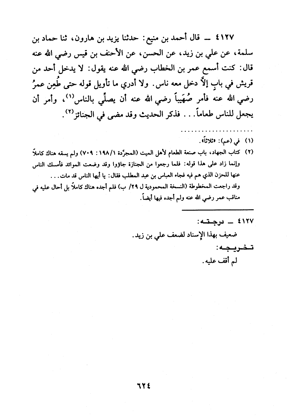 4127 - قَالَ أَحْمَدُ بْنُ مَنِيعٍ: حدثنا يَزِيدُ بْنُ هَارُونَ، ثنا حَمَّادُ بْنُ سَلَمَةَ، عَنْ عَلِيِّ بْنِ زَيْدٍ، عَنِ الْحَسَنِ، عَنِ الْأَحْنَفِ بْنِ قَيْسٍ رَضِيَ الله عَنْه قَالَ: كُنْتُ أَسْمَعُ عُمَرَ بْنَ الْخَطَّابِ رَضِيَ الله عَنْه يَقُولُ: §لَا يَدْخُلُ أَحَدٌ مِنْ قُرَيْشٍ فِي بَابٍ إِلَّا دَخَلَ مَعَهُ نَاسٌ. وَلَا أَدْرِي مَا تَأْوِيلُ قَوْلِهِ حَتَّى طُعِنَ عُمَرُ رَضِيَ الله عَنْه فَأَمَرَ صُهَيْبًا رَضِيَ الله عَنْه أَنْ يصلي بالناس، وأمر أَنْ يَجْعَلَ لِلنَّاسِ طَعَامًا ... فَذَكَرَ الْحَدِيثَ وَقَدْ مَضَى فِي الْجَنَائِزِ.