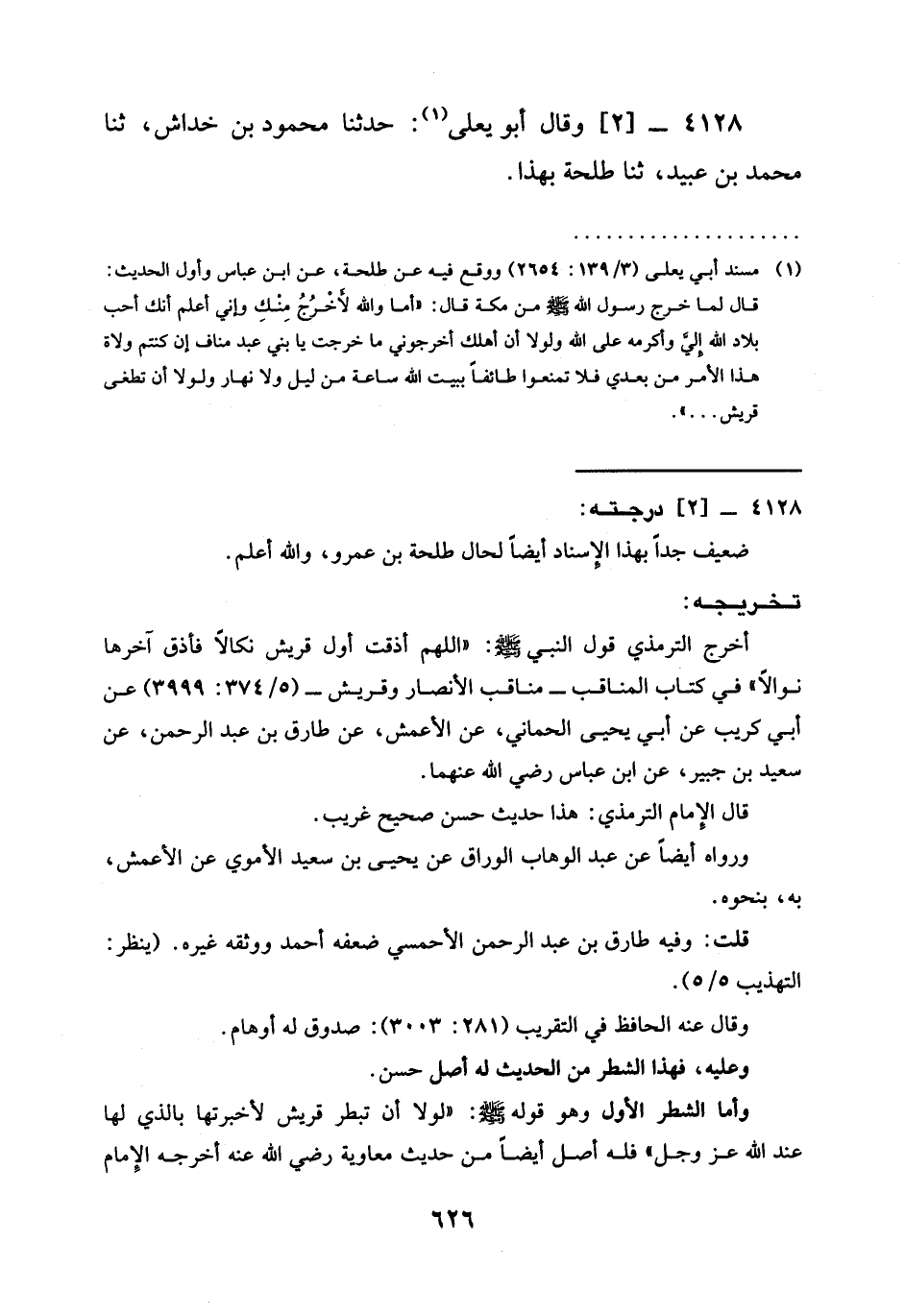 4128 - [2] وقال أبو يعلى (¬1): حدّثنا مَحْمُودُ بْنُ خِدَاشٍ، ثنا محمَّد بْنُ عُبَيْدٍ، ثنا طلحة بهذا.