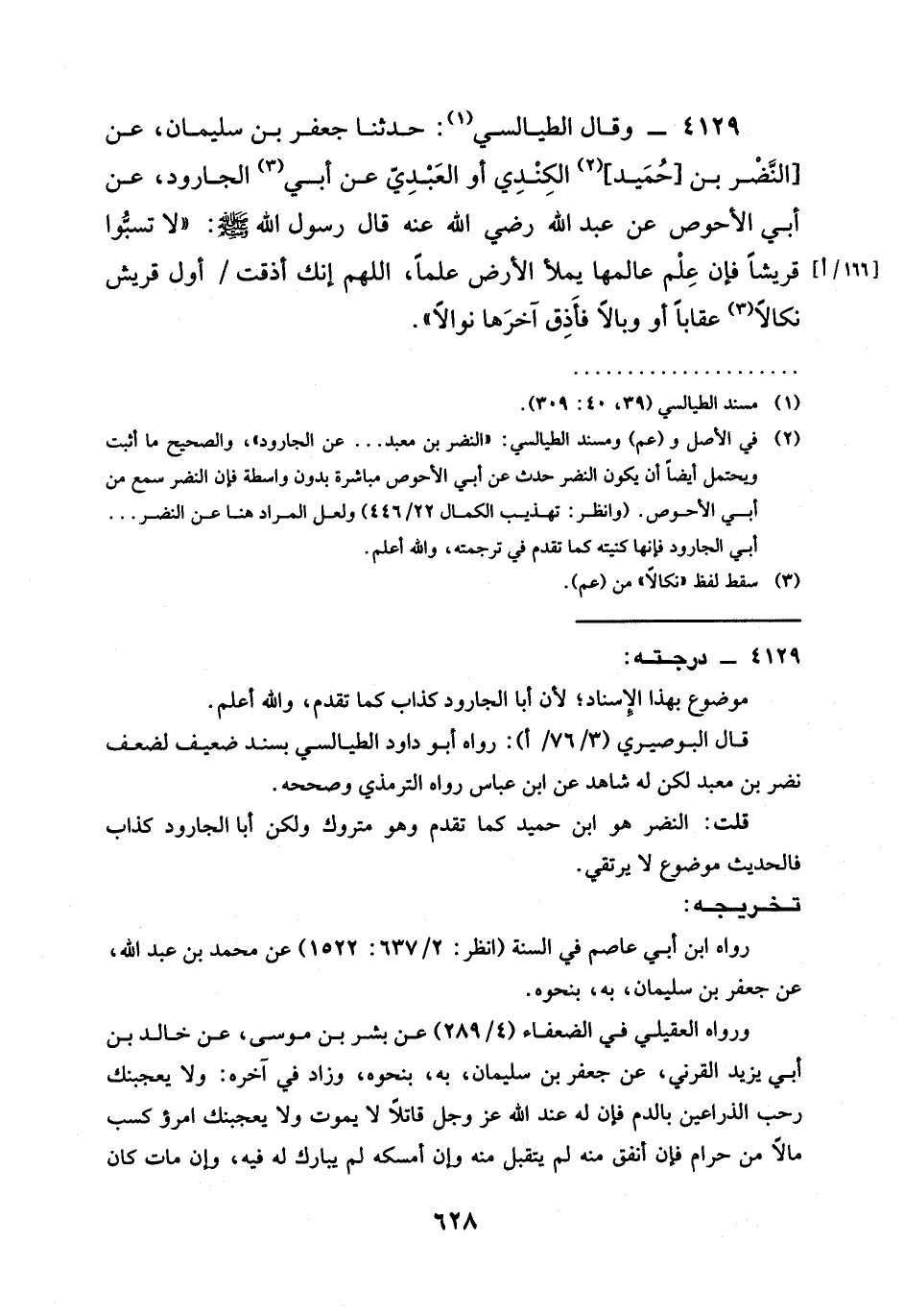 4129 - وَقَالَ الطَّيَالِسِيُّ: حدثنا جَعْفَرُ بْنُ سُلَيْمَانَ، عَنِ [النضر بن [حميد] الْكِنْدِيِّ أَوِ الْعَبْدِيِّ عن أبي الْجَارُودِ، عَنْ أَبِي الْأَحْوَصِ عَنْ عَبْدِ اللَّهِ رَضِيَ الله عَنْه قَالَ رَسُولُ اللَّهِ صَلَّى اللَّهُ عَلَيْهِ وَسَلَّمَ: " §لَا تَسُبُّوا قريشا فإن علم عَالِمَهَا يَمْلَأُ الْأَرْضَ عِلْمًا، اللَّهُمَّ إِنَّكَ أَذَقْتَ / أَوَّلَ قريش نكالا عِقَابًا أَوْ وَبَالًا فَأَذِقْ آخِرَهَا نَوَالًا ".