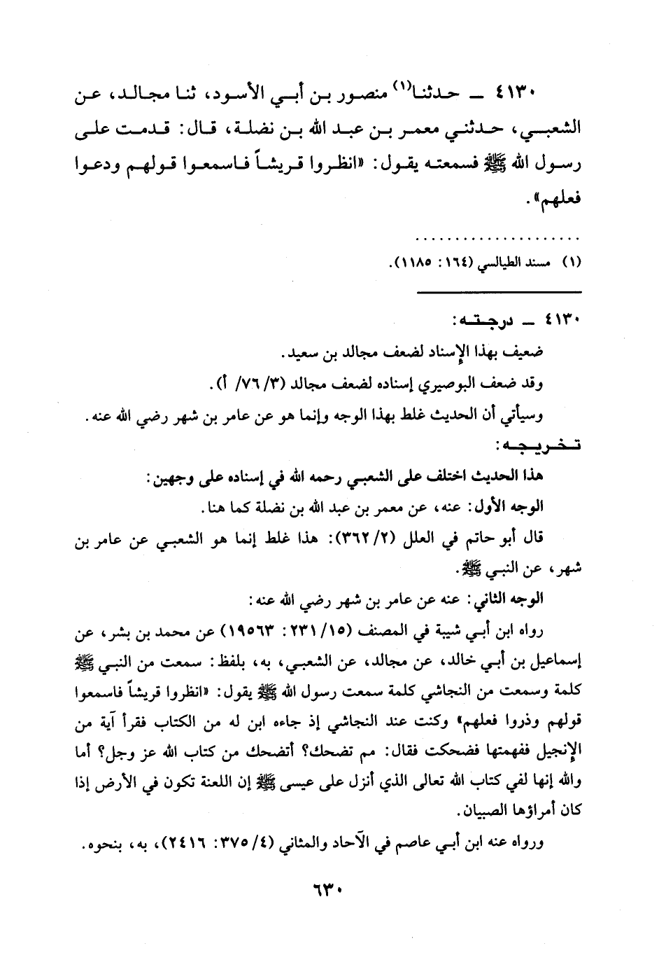 4130 - حدثنا مَنْصُورُ بْنُ أَبِي الْأَسْوَدِ، ثنا مُجَالِدٌ، عَنِ الشَّعْبِيِّ، حَدَّثَنِي مَعْمَرُ بْنُ عَبْدِ اللَّهِ بْنِ نَضْلَةَ، قَالَ: قَدِمْتُ عَلَى رَسُولِ اللَّهِ صَلَّى اللَّهُ عَلَيْهِ وَسَلَّمَ فَسَمِعْتُهُ يَقُولُ: " §انْظُرُوا قُرَيْشًا فَاسْمَعُوا قَوْلَهُمْ وَدَعُوا فِعْلَهُمْ ".