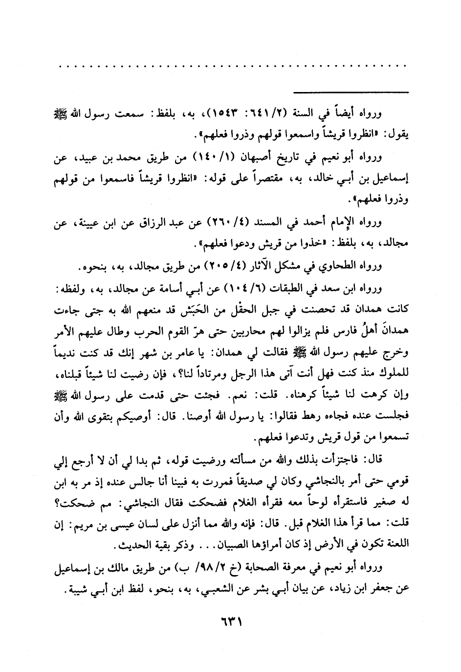 ورواه الإِمام أحمد في المسند (4/ 260) عَنْ عَبْدِ الرَّزَّاقِ عَنِ ابْنِ عُيَيْنَةَ، عَنْ مجالد، به، بلفظ: "خذوا من قريش ودعوا فعلهم".