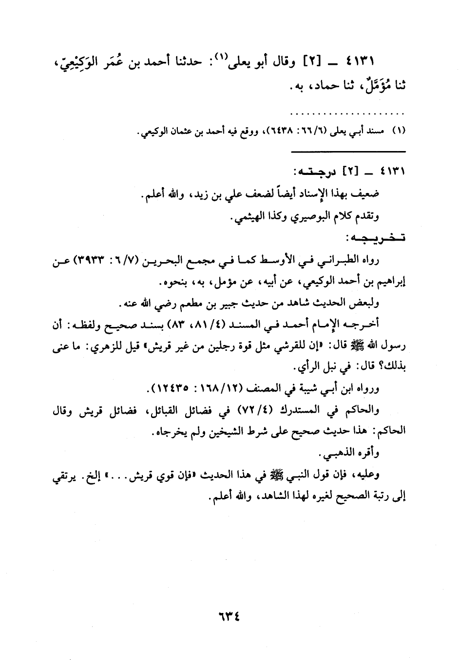 4131 - [2] وَقَالَ أَبُو يَعْلَى (¬1): حَدَّثَنَا أَحْمَدُ بْنُ عُمَر الوَكِيْعِيّ، ثنا مُؤَمَّلٌ، ثنا حماد، به.