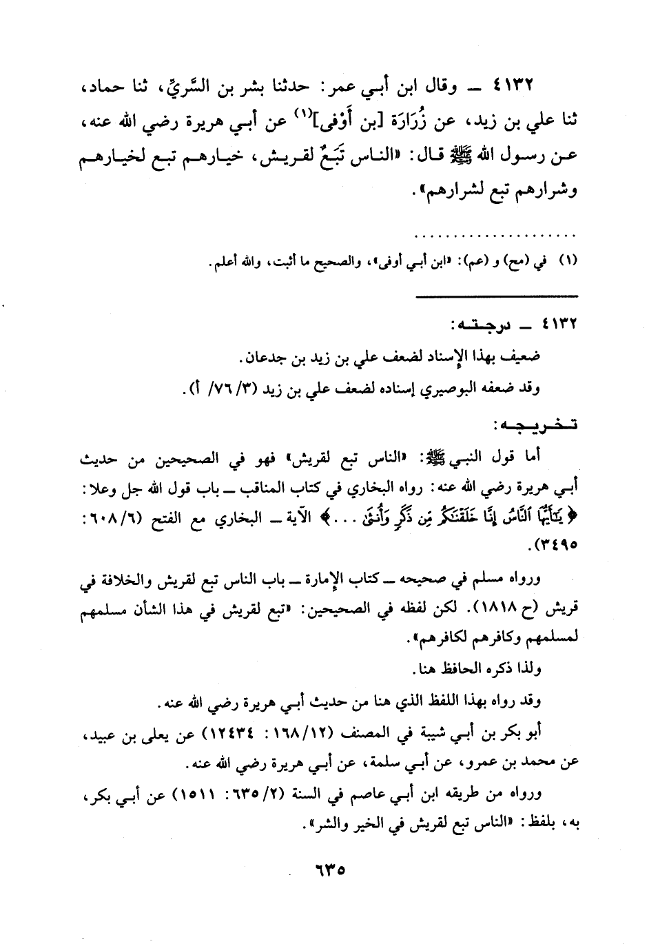4132 - وَقَالَ ابْنُ أَبِي عُمَرَ: حدثنا بِشْرُ بْنُ السَّرِيِّ، ثنا حَمَّادٌ، ثنا عَلِيُّ بْنُ زَيْدٍ، عَنْ زُرَارَةَ [بْنِ أَوْفَى] عَنْ أَبِي هُرَيْرَةَ رَضِيَ الله عَنْه، عَنْ رَسُولِ اللَّهِ صَلَّى اللَّهُ عَلَيْهِ وَسَلَّمَ قَالَ: " §النَّاسُ تَبَعٌ لِقُرَيْشٍ، خِيَارُهُمْ تَبَعٌ لِخِيَارِهِمْ وَشِرَارُهُمْ تَبَعٌ لِشِرَارِهِمْ ".