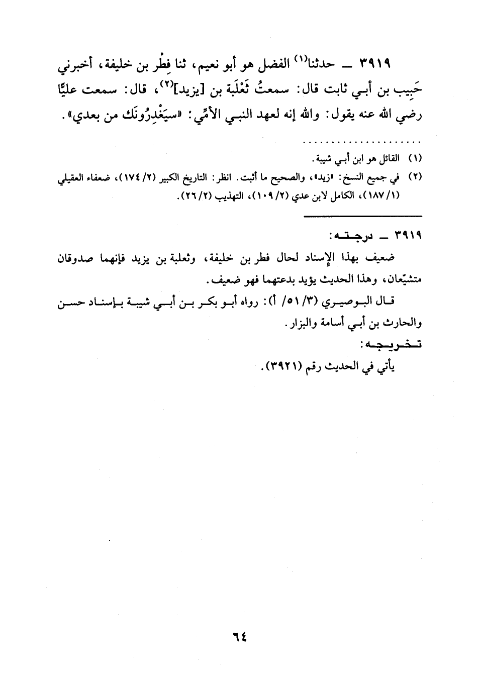 3919 - حَدَّثَنَا الْفَضْلُ هُوَ أَبُو نُعَيْمٍ، ثنا فِطْرُ بْنُ خَلِيفَةَ، أَخْبَرَنِي حَبِيبُ بْنُ أَبِي ثَابِتٍ قَالَ: سَمِعْتُ ثَعْلَبَةَ بْنَ [يَزِيدَ] ، قَالَ: سَمِعْتُ عَلِيًّا رَضِيَ الله عَنْه يَقُولُ: وَاللَّهِ إِنَّهُ لَعَهْدُ النَّبِيِّ الْأُمِّيِّ: " §سَيِغْدِرُونَكَ مِنْ بَعْدِي ".