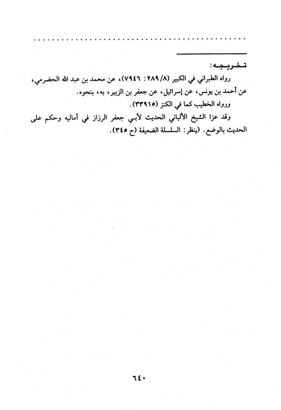 وقد عزا الشيخ الألباني الحديث لأبي جعفر الرزاز في أماليه وحكم على الحديث بالوضع. (ينظر: السلسلة الضعيفة (ح 345).