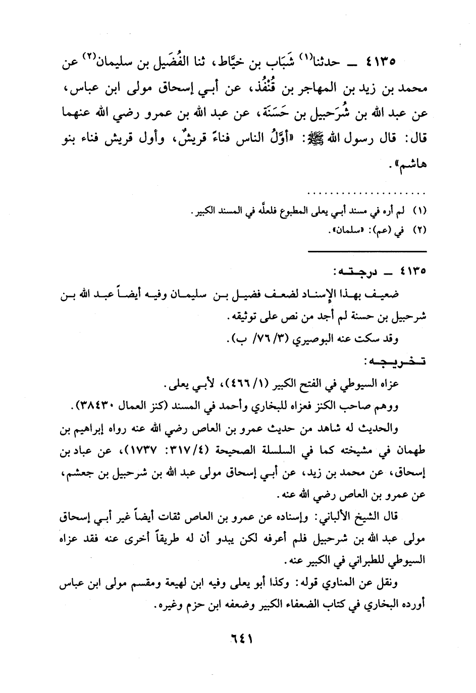 4135 - حدثنا شَبَّابُ بْنُ خَيَّاطٍ، ثنا الفضيل بْنُ سُلَيْمَانَ عَنْ مُحَمَّدِ بْنِ زَيْدِ بْنِ الْمُهَاجِرِ بْنِ قُنْفُذٍ، عَنْ أَبِي إِسْحَاقَ مَوْلَى ابْنِ عَبَّاسٍ، عَنْ عَبْدِ اللَّهِ بْنِ شُرَحْبِيلَ بْنِ حَسَنَةَ، عَنْ عَبْدِ اللَّهِ بن عمرو رَضِيَ الله عَنْهما قَالَ: قَالَ رَسُولُ اللَّهِ صَلَّى اللَّهُ عَلَيْهِ وَسَلَّمَ: " §أَوَّلُ الناس فناء قُرَيْشٌ، وَأَوَّلُ قُرَيْشٍ فَنَاءً بَنُو هَاشِمٍ ".