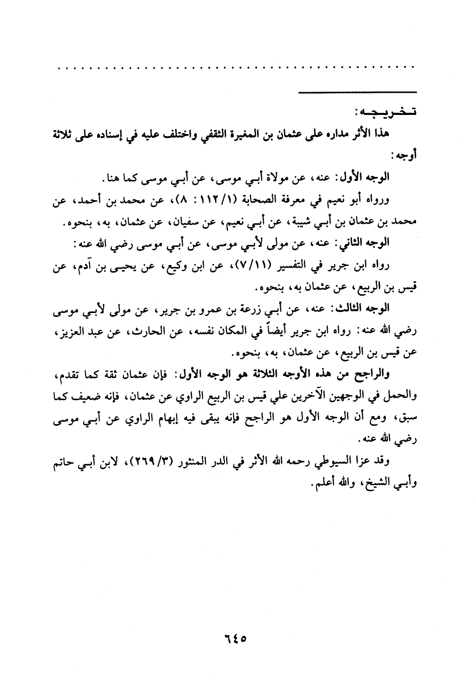 والراجح من هذه الأوجه الثلاثة هو الوجه الأول: فإن عثمان ثقة كما تقدم، والحمل في الوجهين الآخرين علي قيس بن الربيع الراوي عن عثمان، فإنه ضعيف كما سبق، ومع أن الوجه الأول هو الراجح فإنه يبقى فيه إبهام الراوي عن أبي موسى رضي الله عنه.