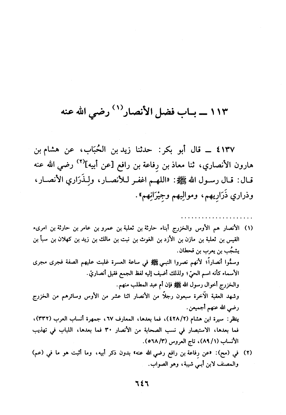 4137 - قَالَ أَبُو بَكْرٍ: حدثنا زَيْدُ بْنُ الْحُبَابِ، عَنْ هِشَامِ بْنِ هَارُونَ الْأَنْصَارِيِّ، ثنا مُعَاذُ بْنُ رِفَاعَةَ بْنِ رَافِعٍ [عَنْ أَبِيهِ] رَضِيَ الله عَنْه قَالَ: قَالَ رَسُولُ اللَّهِ صَلَّى اللَّهُ عَلَيْهِ وَسَلَّمَ: " §اللَّهُمَّ اغْفِرْ لِلْأَنْصَارِ، وَلِذَرَارِيِّ الْأَنْصَارِ، وَذَرَارِيِّ ذَرَارِيِّهِمْ، وَمَوَالِيهِمْ وَجِيرَانِهِمْ ".