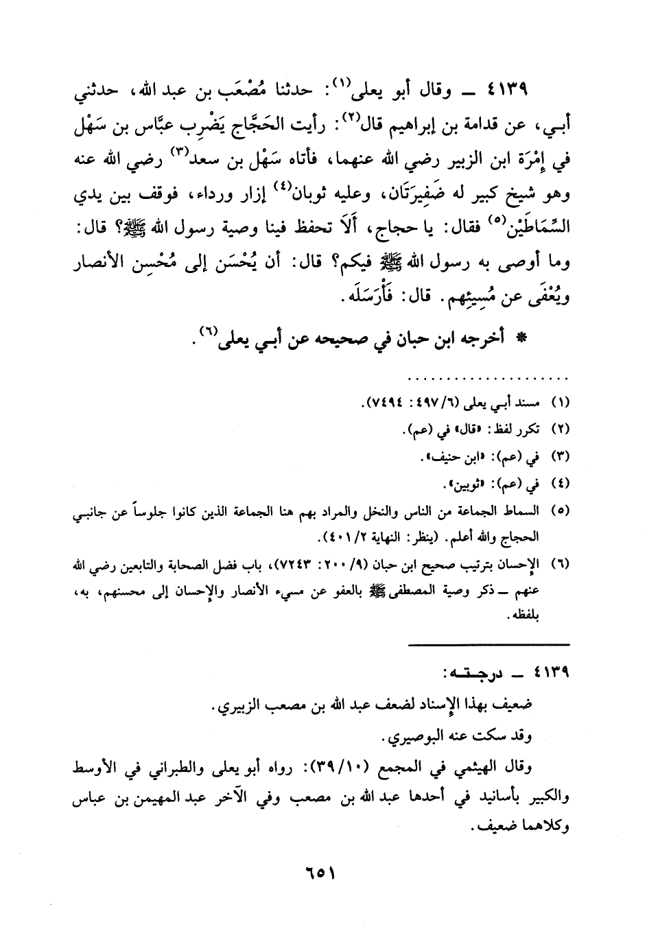 4139 - وَقَالَ أَبُو يَعْلَى: حدثنا مُصْعَبُ بْنُ عَبْدِ اللَّهِ، حَدَّثَنِي أَبِي، عَنْ قُدَامَةَ بْنِ إِبْرَاهِيمَ قَالَ: رَأَيْتُ الْحَجَّاجَ يَضْرِبُ عَبَّاسَ بْنَ سهل في إمرة ابْنِ الزبير رَضِيَ الله عَنْهما، فَأَتَاهُ سَهْلُ بْنُ سَعْدٍ رَضِيَ الله عَنْه وَهُوَ شَيْخٌ كَبِيرٌ لَهُ ضَفِيرَتَانِ، وَعَلَيْهِ ثَوْبَانِ إِزَارٌ وَرِدَاءٌ، فوقف بين يدي السِّمَاطَيْنِ فَقَالَ: يَا حَجَّاجُ، أَلَا تَحْفَظُ فِينَا وَصِيَّةَ رَسُولِ اللَّهِ صَلَّى اللَّهُ عَلَيْهِ وَسَلَّمَ؟ قَالَ: وَمَا أَوْصَى بِهِ رَسُولُ اللَّهِ صَلَّى اللَّهُ عَلَيْهِ وَسَلَّمَ فِيكُمْ؟ قَالَ: أَنْ §يُحْسَنَ إِلَى مُحْسِنِ الْأَنْصَارِ وَيُعْفَى عَنْ مُسِيئِهِمْ. قَالَ: فَأَرْسَلَهُ.