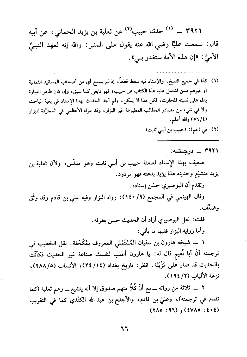 3921 - (¬1) حدّثنا حَبِيبٍ (¬2) عَنْ ثَعْلَبَةَ بْنِ يَزِيدَ الْحِمَّانِيِّ، عَنْ أبيه قَالَ: سَمِعْتُ عَلِيًّا رَضِيَ اللَّهُ عَنْهُ يَقُولُ عَلَى الْمِنْبَرِ: وَاللَّهِ إِنَّهُ لَعَهْدُ النبيِّ الأميِّ: "إن هذه الأمة ستغدر بي".