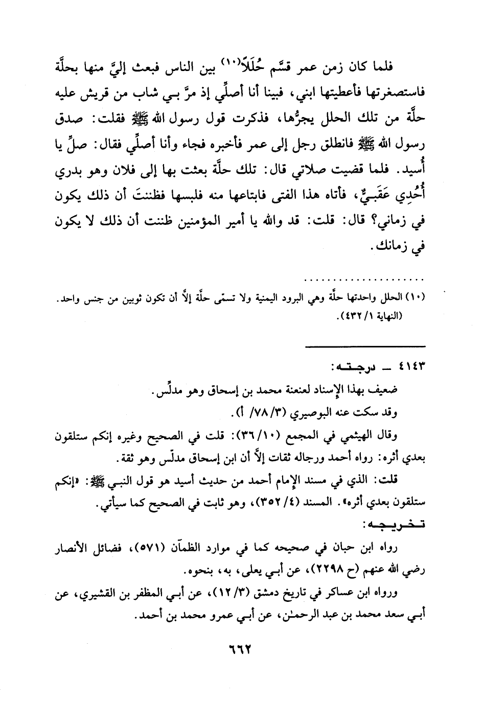 فَلَمَّا كَانَ زَمَنُ عُمَرَ قسَّم حُلَلًا (¬10) بَيْنَ النَّاسِ فَبَعَثَ اليَّ مِنْهَا بحلَّة فَاسْتَصْغَرْتُهَا فَأَعْطَيْتُهَا ابني، فبينا أَنَا أصلِّي إِذْ مرَّ بِي شَابٌّ مِنْ قُرَيْشٍ عَلَيْهِ حلَّة مِنْ تِلْكَ الْحُلَلِ يجرُّها، فَذَكَرْتُ قَوْلَ رَسُولِ اللَّهِ -صَلَّى اللَّهُ عَلَيْهِ وَسَلَّمَ- فَقُلْتُ: صَدَقَ رَسُولُ اللَّهِ -صَلَّى اللَّهُ عَلَيْهِ وَسَلَّمَ- فَانْطَلَقَ رَجُلٌ إِلَى عُمَرَ فَأَخْبَرَهُ فَجَاءَ وَأَنَا أصلِّي فَقَالَ: صلِّ يَا أُسيد. فَلَمَّا قَضَيْتُ صَلَاتِي قَالَ: تِلْكَ حلَّة بَعَثْتُ بِهَا إِلَى فُلَانٍ وَهُوَ بَدْرِيٌّ أُحُدِي عَقَبيٌّ، فَأَتَاهُ هَذَا الْفَتَى فَابْتَاعَهَا مِنْهُ فَلَبِسَهَا فظننتَ أَنَّ ذَلِكَ يَكُونُ فِي زَمَانِي؟ قَالَ: قُلْتُ: قَدْ وَاللَّهِ يَا أَمِيرَ الْمُؤْمِنِينَ ظَنَنْتُ أَنَّ ذلك لا يكون في زمانك.