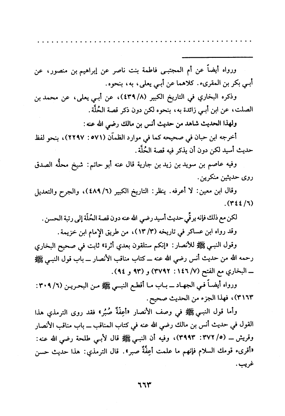 وأما قول النبي -صلى الله عليه وسلم- في وصف الأنصار "أعِفّةٌ صُبُر" فقد روى الترمذي هذا القول في حديث أَنَسُ بْنُ مَالِكٍ رَضِيَ اللَّهُ عَنْهُ فِي كتاب المناقب -باب مناقب الأنصار وقريش- (5/ 372: 3993)، وفيه أن النبي -صلى الله عليه وسلم- قال لأبي طلحة رضي الله عنه: "أقرىء قومك السلام فإنهم ما علمت أعِفَّةٌ صبر". قال الترمذي: هذا حديث حسن غريب. =