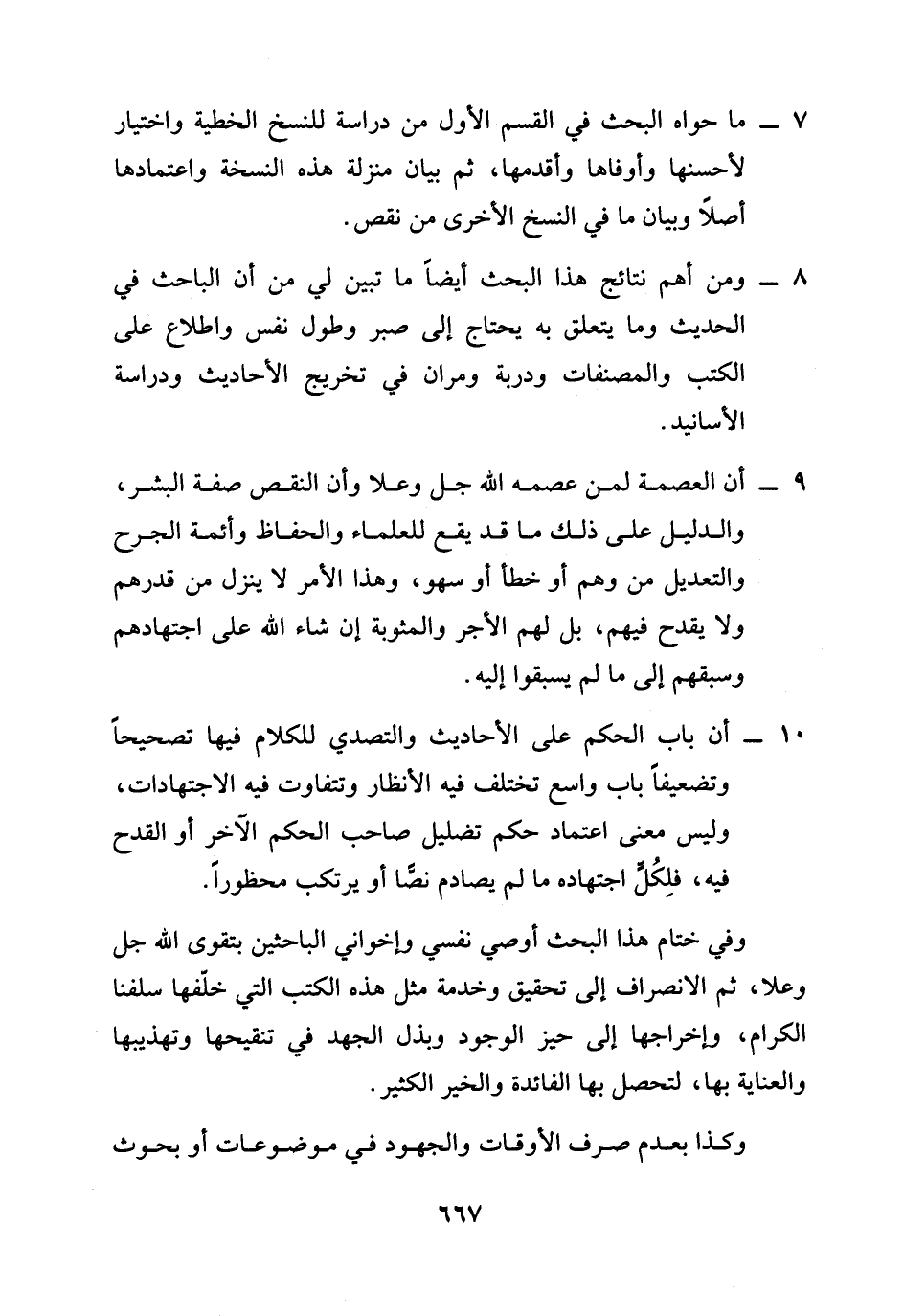 10 - أن باب الحكم على الأحاديث والتصدي للكلام فيها تصحيحًا وتضعيفًا باب واسع تختلف فيه الأنظار وتتفاوت فيه الاجتهادات، وليس معنى اعتماد حكم تضليل صاحب الحكم الآخر أو القدح فيه، فلِكُلٍّ اجتهاده ما لم يصادم نصًّا أو يرتكب محظورًا.