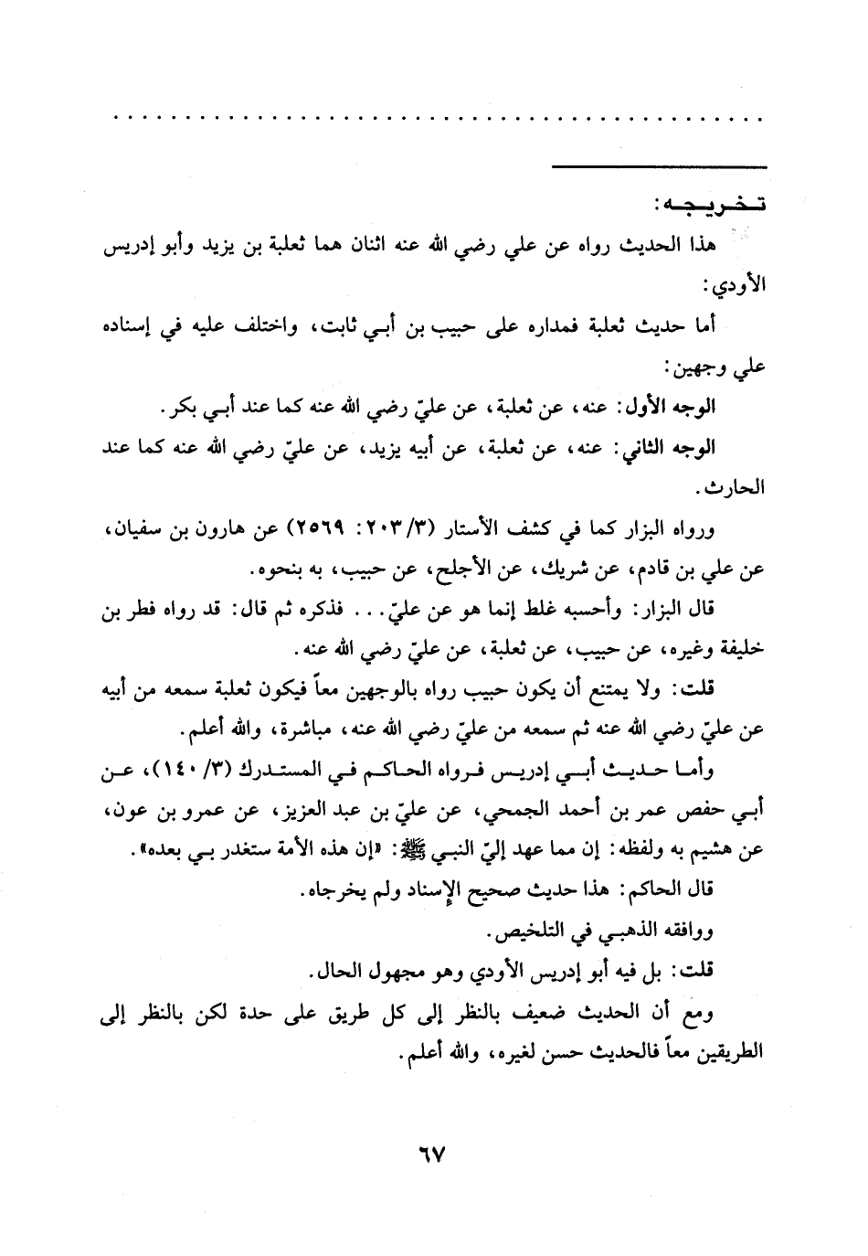 قلت: ولا يمتنع أن يكون حبيب رواه بالوجهين معًا فيكون ثعلبة سمعه من أبيه عن عليّ رضي الله عنه ثم سمعه من عليّ رضي الله عنه، مباشرة، والله أعلم.