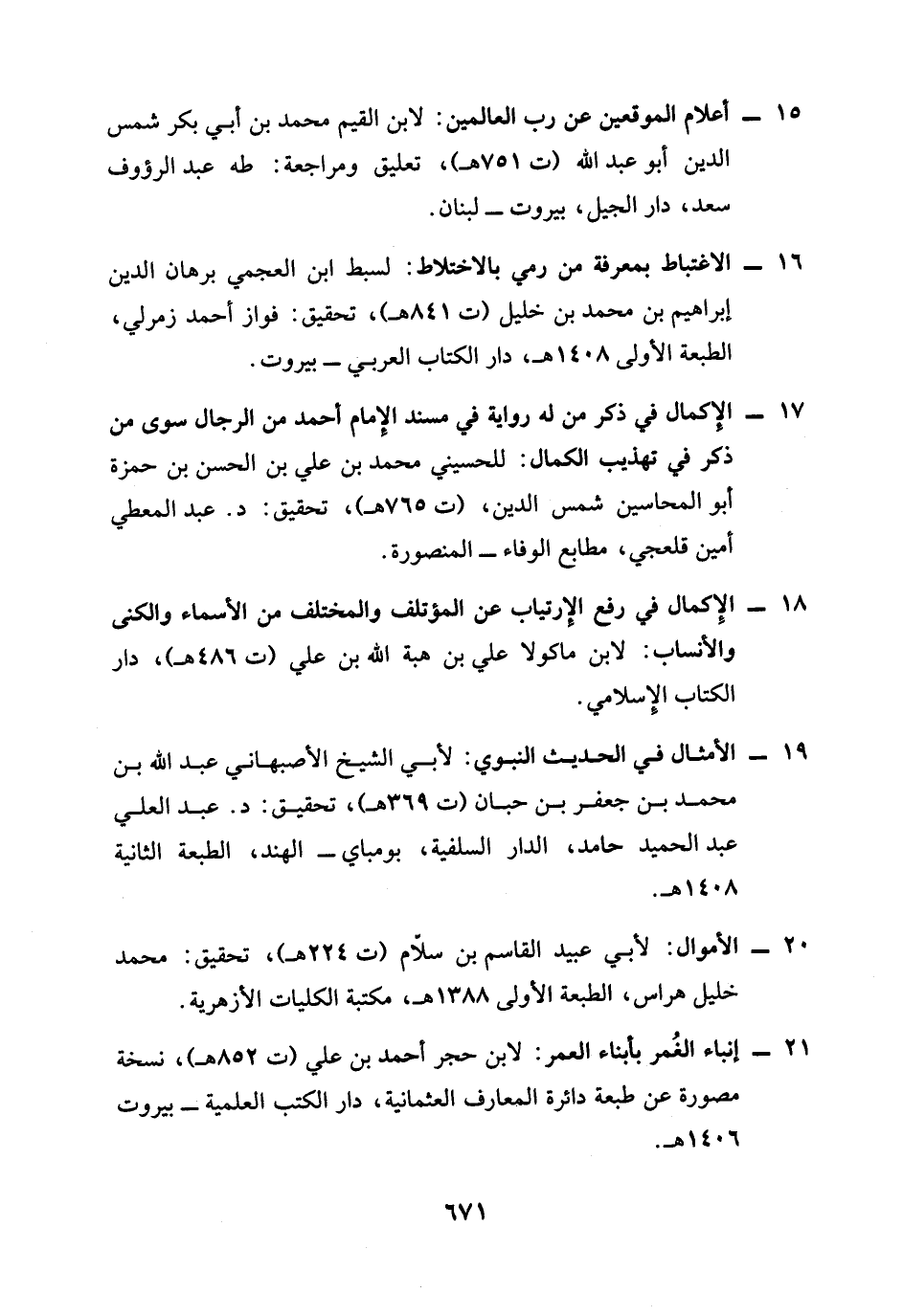 18 - الإِكمال في رفع الإرتياب عن المؤتلف والمختلف من الأسماء والكنى والإنساب: لابن ماكولا علي بن هبة الله بن علي (ت 486 هـ)، دار الكتاب الإِسلامي.