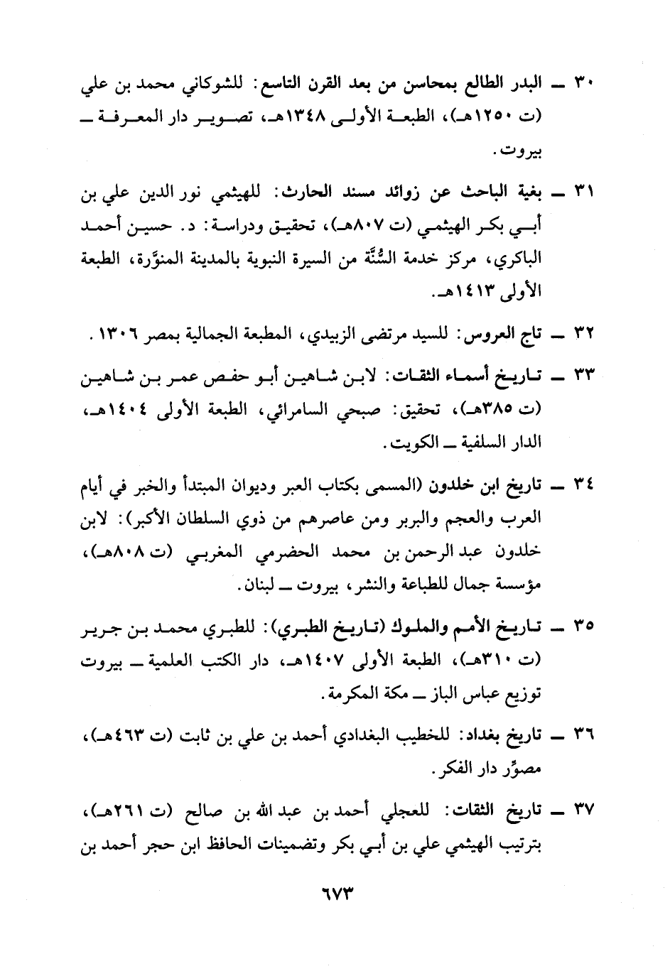 30 - البدر الطالع بمحاسن من بعد القرن التاسع: للشوكاني محمَّد بن علي (ت 1250 هـ)، الطبعة الأولى 1348 هـ، تصوير دار المعرفة- بيروت.