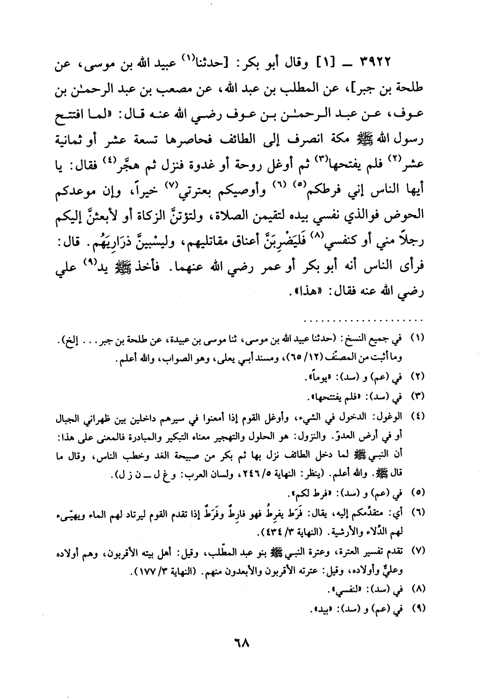 3922 -[1] وَقَالَ أَبُو بَكْرٍ: [حدثنا عُبَيْدُ اللَّهِ بْنُ مُوسَى، عَنْ طَلْحَةَ بْنِ جَبْرٍ] ، عَنِ الْمُطَّلِبِ بْنِ عَبْدِ اللَّهِ، عَنْ مُصْعَبِ بْنِ عَبْدِ الرَّحْمَنِ بْنِ عَوْفٍ، عَنْ عَبْدِ الرَّحْمَنِ بْنِ عَوْفٍ رَضِيَ الله عَنْه قَالَ: " لَمَّا افْتَتَحَ رَسُولُ اللَّهِ صَلَّى اللَّهُ عَلَيْهِ وَسَلَّمَ مَكَّةَ انْصَرَفَ إِلَى الطَّائِفِ فَحَاصَرَهَا تِسْعَةَ عَشَرَ أَوْ ثَمَانِيَةَ عَشَرَ فَلَمْ يَفْتَحْهَا ثُمَّ أَوْغَلَ رَوْحَةً أَوْ غُدْوَةً فَنَزَلَ ثُمَّ هَجَرَ فَقَالَ: يَا أَيُّهَا الناس §إني فرطكم وَأُوصِيكُمْ بِعِتْرَتِي خَيْرًا، وَإِنَّ مَوْعِدَكُمُ الْحَوْضُ فَوَالَّذِي نَفْسِي بِيَدِهِ لتقيمن الصَّلَاةَ، ولتؤتن الزَّكَاةَ أَوْ لَأَبْعَثَنَّ إليكم رَجُلًا مِنِّي أَوْ كَنَفْسِي فَلْيَضْرِبَنَّ أَعْنَاقَ مقاتليهم، وَلْيَسْبِيَنَّ ذَرَارِيَّهُمْ. قَالَ: فَرَأَى النَّاسُ أَنَّهُ أَبُو بَكْرٍ أو عمر رَضِيَ الله عَنْهما. فأخذ صَلَّى اللَّهُ عَلَيْهِ وَسَلَّمَ يد عَلِيٍّ رَضِيَ الله عَنْه فَقَالَ: " هَذَا -[70]- ".
