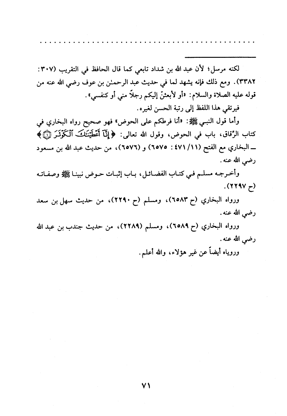 وأما قول النبي -صلى الله عليه وسلم-: "أنا فرطكم على الحوض" فهو صحيح رواه البخاري في كتاب الرِّقاق، باب في الحوض، وقول الله تعالى: {إِنَّا أَعْطَيْنَاكَ الْكَوْثَرَ (1)} - البخاري مع الفتح (11/ 471: 6575) و (6576)، من حديث عَبْدِ اللَّهِ بْنِ مَسْعُودٍ رَضِيَ اللَّهُ عَنْهُ.