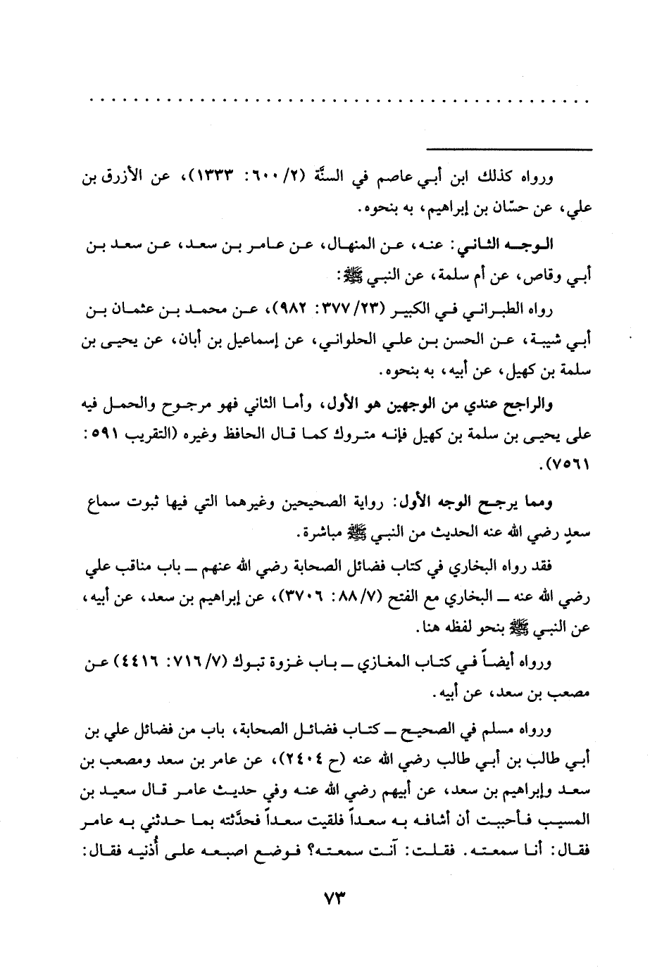 ورواه مسلم في الصحيح- كتاب فضائل الصحابة، باب من فضائل علي بن أبي طالب بن أبي طالب رضي الله عنه (ح 2404)، عن عامر بن سعد ومصعب بن سعد وإبراهيم بن سعد، عن أبيهم رضي الله عنه وفي حديث عامر قال سعيد بن المسيب فأحببت أن أشافه به سعدًا فلقيت سعدًا فحدَّثته مما حدثني به عامر فقال: أنا سمعته. فقلت: آنت سمعته؟ فوضع اصبعه على أُذنيه فقال: =