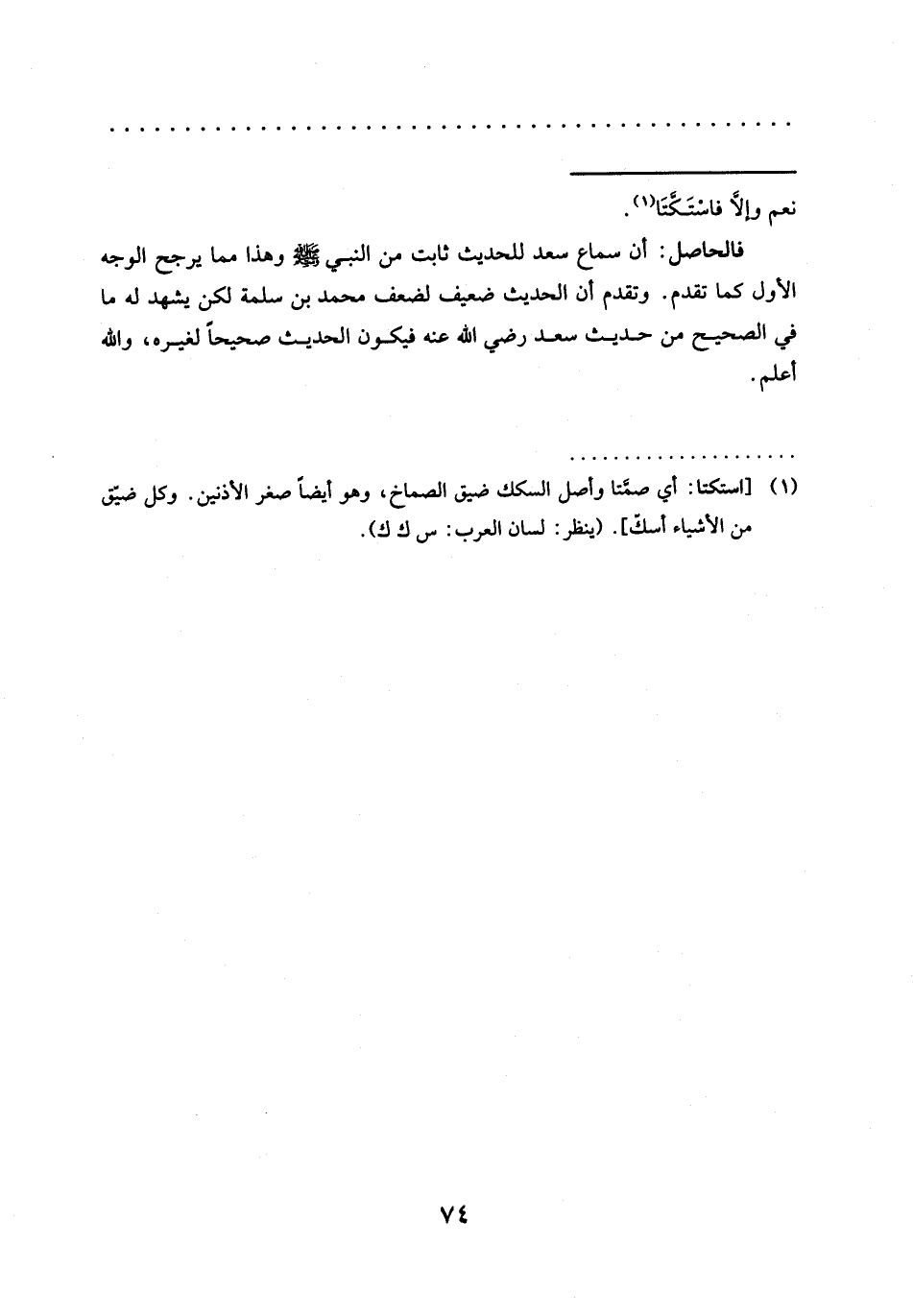 فالحاصل: أن سماع سعد للحديث ثابت من النبي -صلى الله عليه وسلم- وهذا مما يرجح الوجه الأول كما تقدم. وتقدم أن الحديث ضعيف لضعف محمد بن سلمة لكن يشهد له ما في الصحيح من حديث سعد رضي الله عنه فيكون الحديث صحيحًا لغيره، والله أعلم.