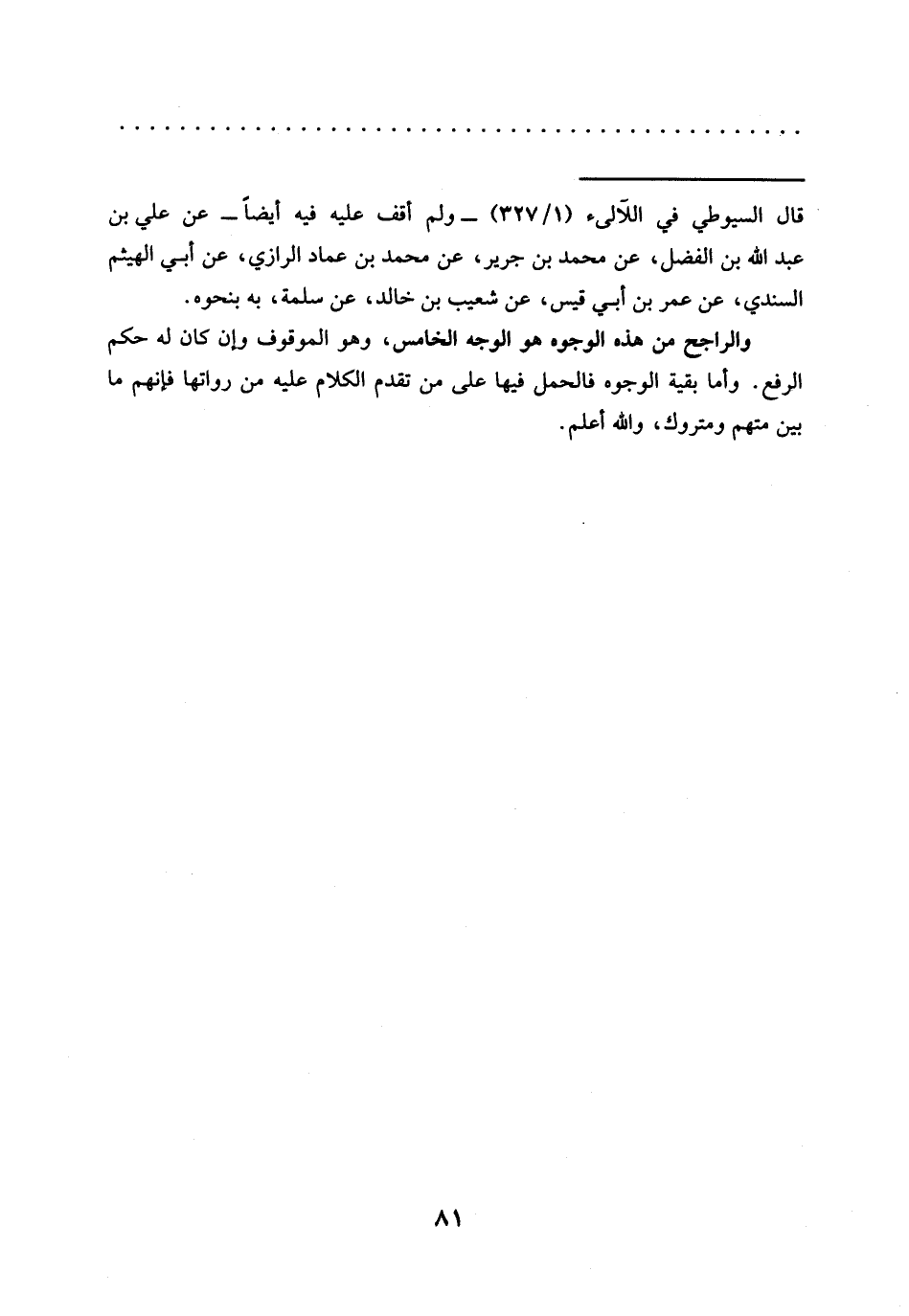والراجح من هذه الوجوه هو الوجه الخامس، وهو الموقوف وإن كان له حكم الرفع. وأما بقية الوجوه فالحمل فيها على من تقدم الكلام عليه من رواتها فإنهم ما بين متهم ومتروك، والله أعلم.