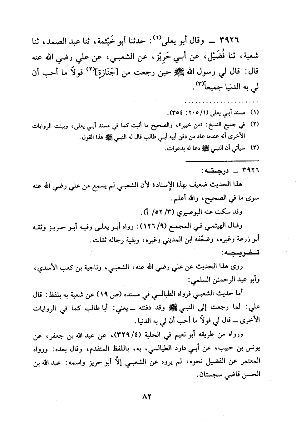 3926 - وَقَالَ أَبُو يَعْلَى: حدثنا أَبُو خَيْثَمَةَ، ثنا عَبْدُ الصَّمَدِ، ثنا شُعْبَةُ، ثنا فُضَيْلٌ، عَنْ أَبِي حَرِيزٍ، عَنِ الشَّعْبِيِّ، عَنْ عَلِيٍّ رَضِيَ الله عَنْه قَالَ: §قَالَ لِي رَسُولُ اللَّهِ صَلَّى اللَّهُ عَلَيْهِ وَسَلَّمَ حِينَ رَجَعْتُ مِنْ [جِنَازَةٍ] قَوْلًا مَا أُحِبُّ أَنَّ لِيَ بِهِ الدُّنْيَا جَمِيعًا.