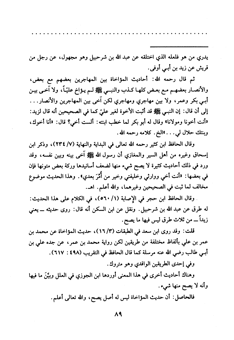 ثم قال رحمه الله: أحاديث المؤاخاة بين المهاجرين بعضهم مع بعض، والأنصار بعضهم مع بعض كلها كذب والنبي -صلى الله عليه وسلم- لم يؤاخ عليًّا، ولا آخى بين أبي بكر وعمر، ولا بين مهاجري ومهاجري لكن آخى بين المهاجرين والأنصار ... إلى أن قَالَ: إِنَّ النَّبِيَّ -صَلَّى اللَّهُ عَلَيْهِ وَسَلَّمَ- قد أثبت الأخوة لغير عليّ كما في الصحيحين أنه قال لزيد: "أنت أخبرنا ومولانا" وقال له أبو بكر لما خطب ابنته: ألست أخي؟ قال: (أنا أخوك، وبنتك حلال لي ... " الخ. كلامه رحمه الله.