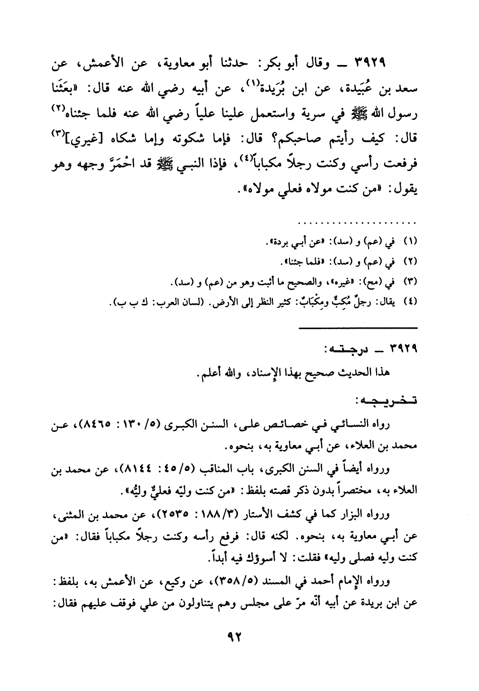 3929 - وَقَالَ أَبُو بَكْرِ: حدثنا أَبُو مُعَاوِيَةَ، عَنِ الْأَعْمَشِ، عَنْ سَعْدِ بْنِ عُبَيْدَةَ، عَنِ ابْنِ بُرَيْدَةَ، عَنْ أَبِيهِ رَضِيَ الله عَنْه قَالَ: " بَعَثَنَا رَسُولُ اللَّهِ صَلَّى اللَّهُ عَلَيْهِ وَسَلَّمَ فِي سَرِيَّةٍ واستعمل علينا عَلِيًّا رَضِيَ الله عَنْه فَلَمَّا جِئْنَاهُ قَالَ: §كَيْفَ رَأَيْتُمْ صَاحِبَكُمْ؟ قَالَ: فَإِمَّا شَكَوْتُهُ وَإِمَّا شَكَاهُ [غَيْرِي] فَرَفَعْتُ رَأْسِي وَكُنْتُ رَجُلًا مِكْبَابًا، فَإِذَا النَّبِيُّ صَلَّى اللَّهُ عَلَيْهِ وَسَلَّمَ قَدِ احْمَرَّ وَجْهُهُ وَهُوَ يَقُولُ: " مَنْ كُنْتُ مَوْلَاهُ فَعَلِيٌّ مَوْلَاهُ ".