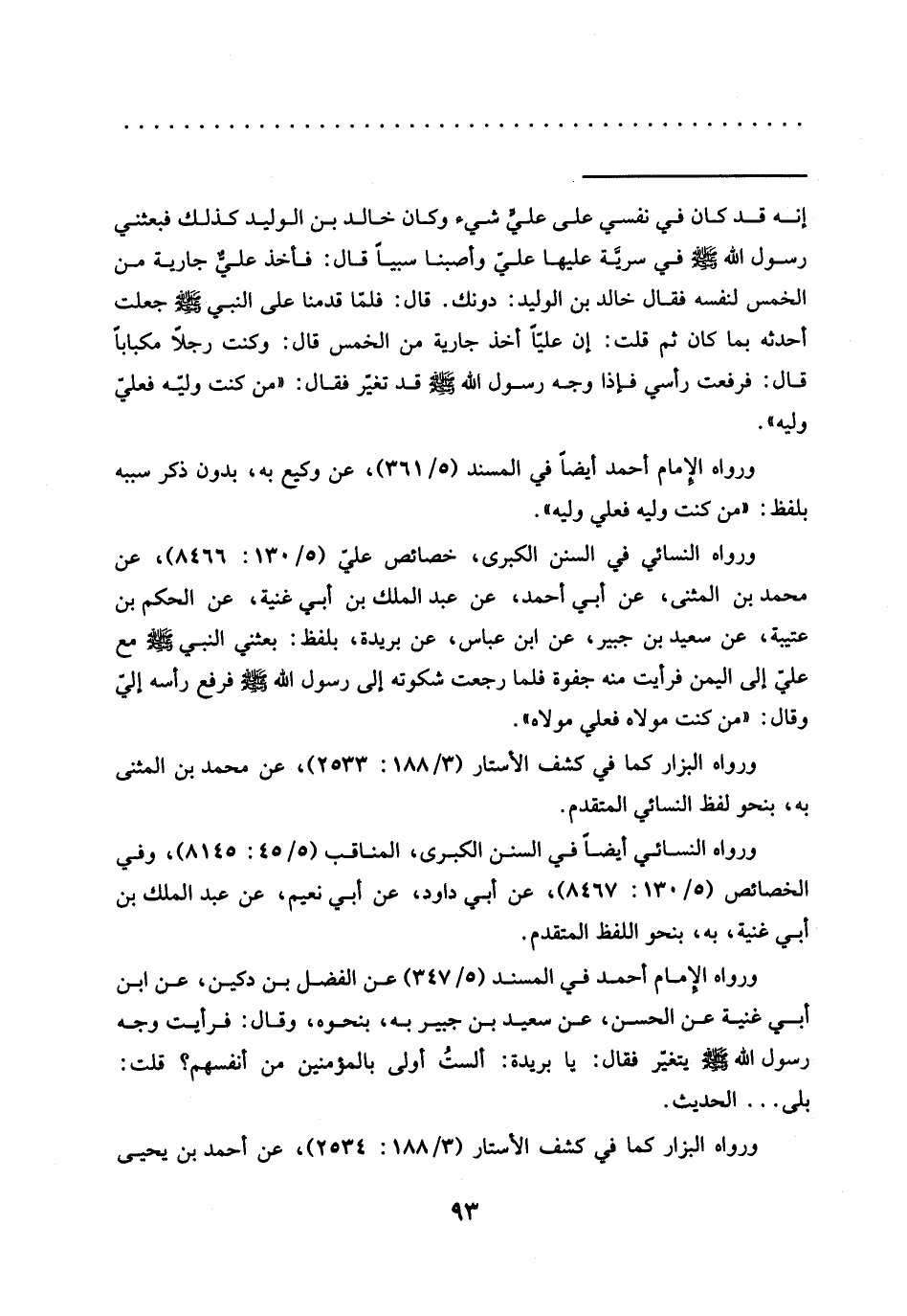 = إنه قد كان في نفسي على عليٍّ شيء وكان خالد بن الوليد كذلك فَبَعَثَنِي رَسُولُ اللَّهِ -صَلَّى اللَّهُ عَلَيْهِ وَسَلَّمَ- في سريَّة عليها عليّ وأصبنا سبيًا قال: فأخذ عليٌّ جارية من الخمس لنفسه فقال خالد بن الوليد: دونك. قال: فلمّا قدمنا على النبي -صلى الله عليه وسلم- جعلت أحدثه بما كان ثم قلت: إن عليًّا أخذ جارية من الخمس قال: وكنت رجلًا مكبابًا قال: فرفعت رأسي فإذا وَجْهِ رَسُولِ اللَّهِ -صَلَّى اللَّهُ عَلَيْهِ وَسَلَّمَ- قد تغيّر فقال: "من كنت وليّه فعليّ وليه".