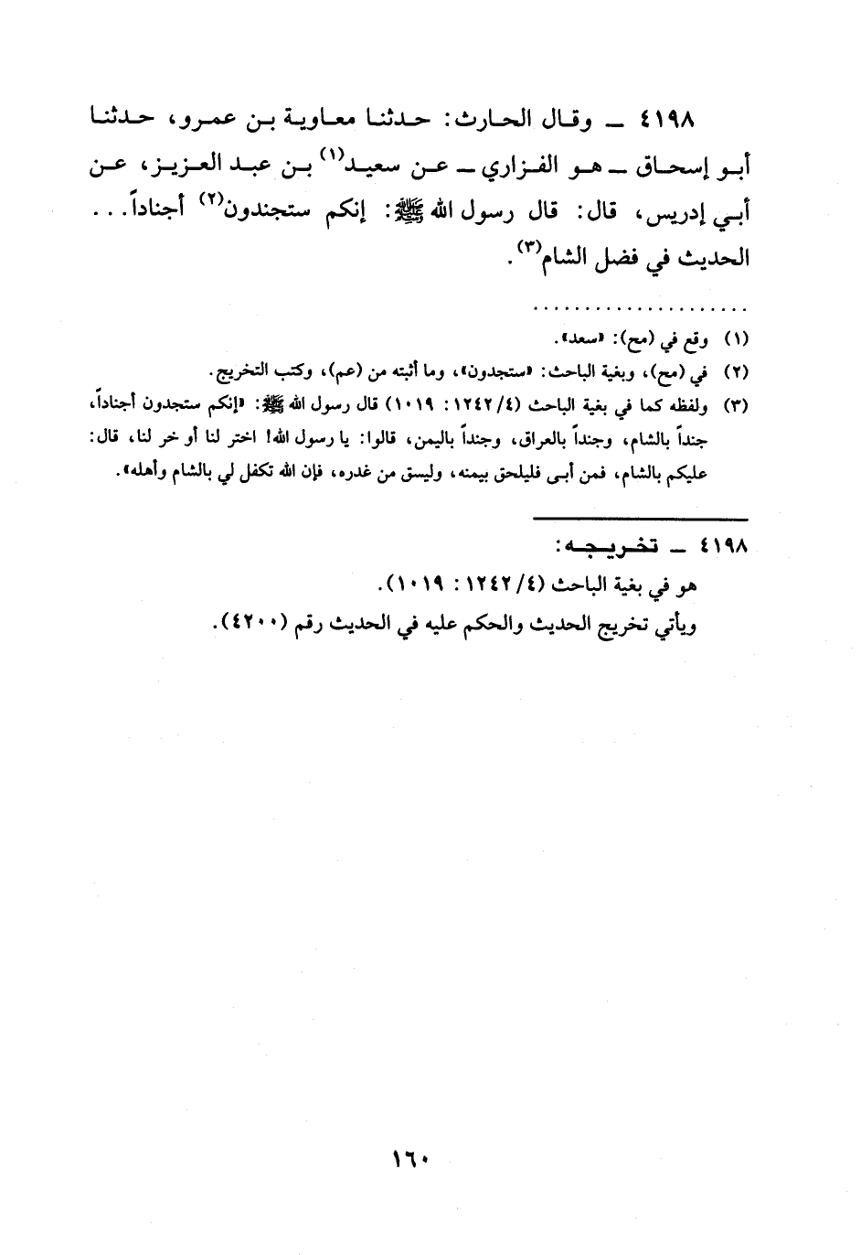 4198 - وقال الْحَارِثُ: حَدَّثَنَا مُعَاوِيَةُ بْنُ عَمْرٍو، حَدَّثَنَا أَبُو إِسْحَاقَ -هُوَ الْفَزَارِيُّ- عَنْ سَعِيدِ (¬1) بْنِ عَبْدِ الْعَزِيزِ، عَنْ أَبِي إِدْرِيسَ، قَالَ: قَالَ رَسُولُ اللَّهِ -صَلَّى اللَّهُ عَلَيْهِ وَسَلَّمَ-: إِنَّكُمْ ستجندون (¬2) أجنادًا ... الحديث في فضل الشام (¬3).