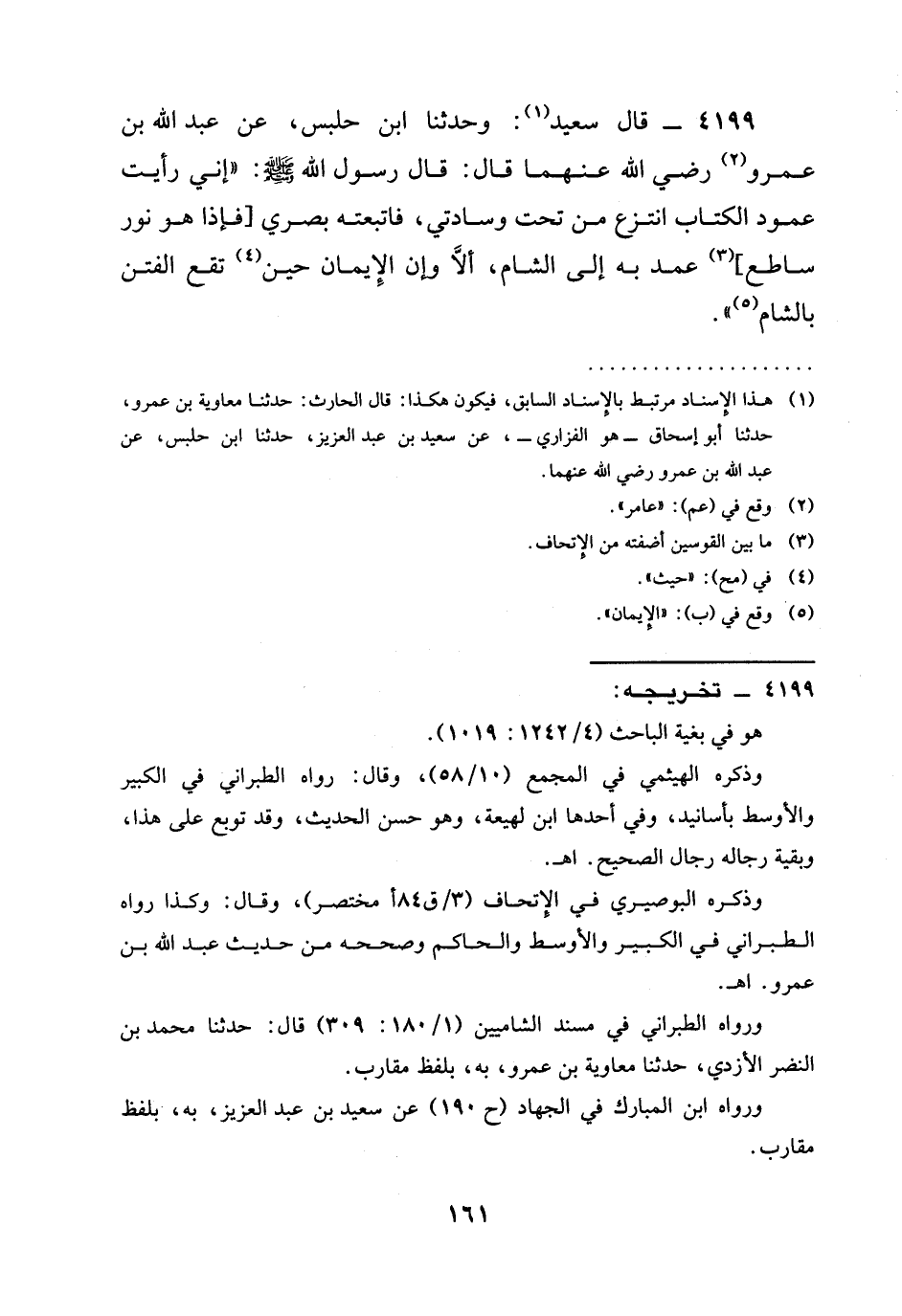 4199 - قَالَ سَعِيدُ: وحدثنا ابْنُ حَلْبَسٍ، عَنْ عَبْدِ اللَّهِ بن عمرو رَضِيَ الله عَنْهما قَالَ: قَالَ رَسُولُ اللَّهِ صَلَّى اللَّهُ عَلَيْهِ وَسَلَّمَ: " إِنِّي §رَأَيْتُ عَمُودَ الْكِتَابِ انْتُزِعَ مِنْ تَحْتِ وِسَادَتِي، فَأَتْبَعْتُهُ بَصَرِي [فَإِذَا هُوَ نُورٌ سَاطِعٌ] عُمِدَ بِهِ إِلَى الشَّامِ، أَلَا وإن الإيمان حين تَقَعُ الْفِتَنُ بِالشَّامِ ".