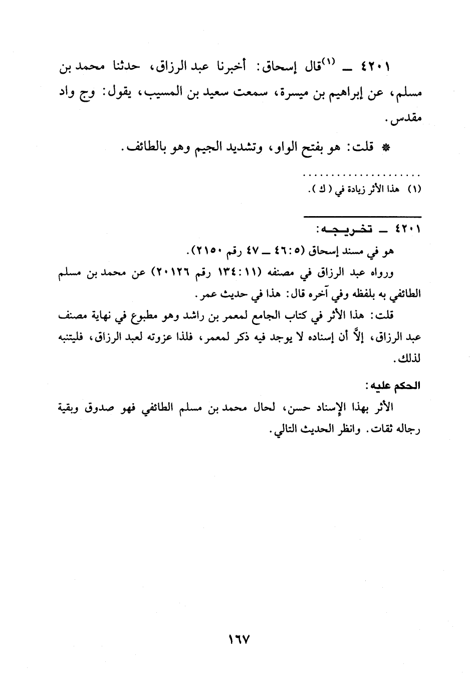 4201 - قَالَ إِسْحَاقُ: أخبرنا عَبْدُ الرَّزَّاقِ، حدثنا مُحَمَّدُ بْنُ مسلم، عَنْ إِبْرَاهِيمَ بْنِ مَيْسَرَةَ، سَمِعْتُ سَعِيدَ بْنَ الْمُسَيِّبِ، يَقُولُ: §وَجٌّ وَادٍ مُقَدَّسٌ.