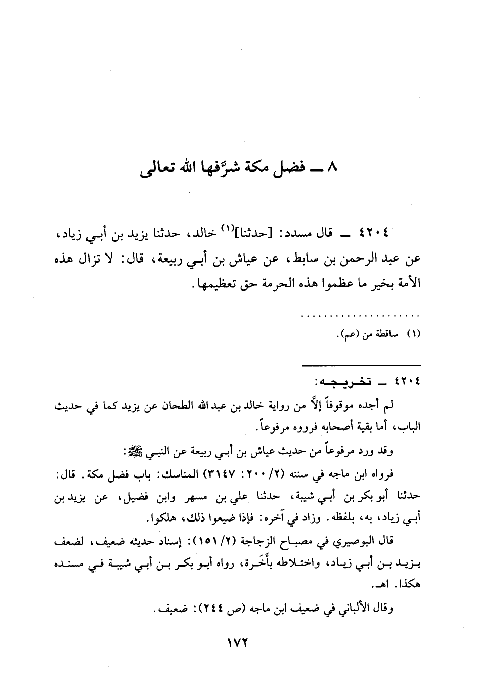 4204 - قَالَ مُسَدَّدٌ: [حدثنا] خَالِدٌ، حدثنا يَزِيدُ بْنُ أَبِي زِيَادٍ، عَنْ عَبْدِ الرَّحْمَنِ بْنِ سَابِطٍ، عَنْ عَيَّاشِ بْنِ أَبِي رَبِيعَةَ، قَالَ: §لَا تَزَالُ هَذِهِ الْأُمَّةُ بِخَيْرٍ مَا عَظَّمُوا هَذِهِ الْحُرْمَةَ حَقَّ تَعْظِيمِهَا.